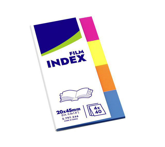Indexflikar av film i sorterade neonfärger som är självhäftande med vattenbaserat lim. Storlek: 20x50mm 4 x 40 självhäftande flikar i olika färger.