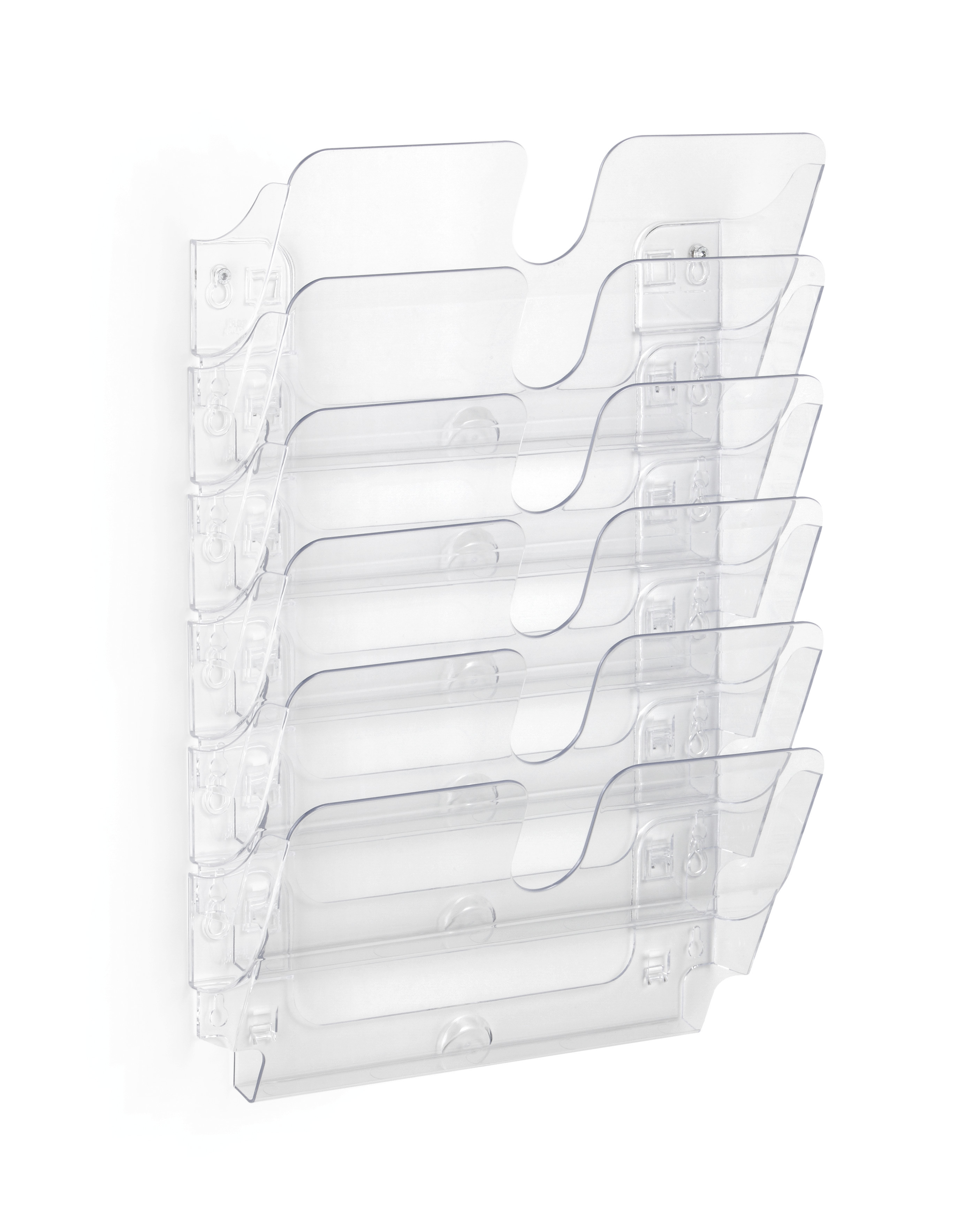 Blankettfack, broschyrställ, postfack - FLEXIPLUS är en serie med platsbesparande, flexibla och väggmonterade hållare för broschyrer, tidskrifter, blanketter och annan information i A4 format. Varje fack har en kapacitet på 24 mm tjocka buntar. Detta är ett komplett set med 6 fack i liggande format där facken kan monteras ihop eller användas var för sig. Ett set med skruv och plugg ingår. Varje facks mått är 34x19,5x3,5 cm (BxHxD). Monterat vinklat ut från väggen bygger den 10 cm och har en bredd på 34 cm och är 52 cm hög när alla 6 fack är ihopsatta. Går att bygga på med fler fack efter behov genom att haka i facken efter varandra. Tillbehör: Fler fack i set om 2, artikelnummer 1709014400Visa mer beskrivningVisa mindre beskrivning -