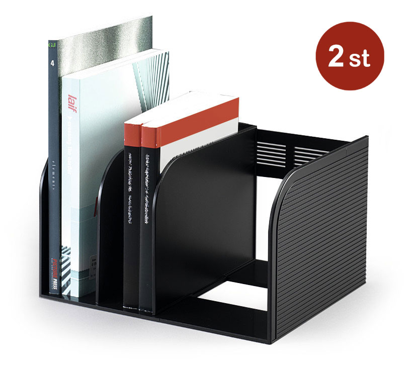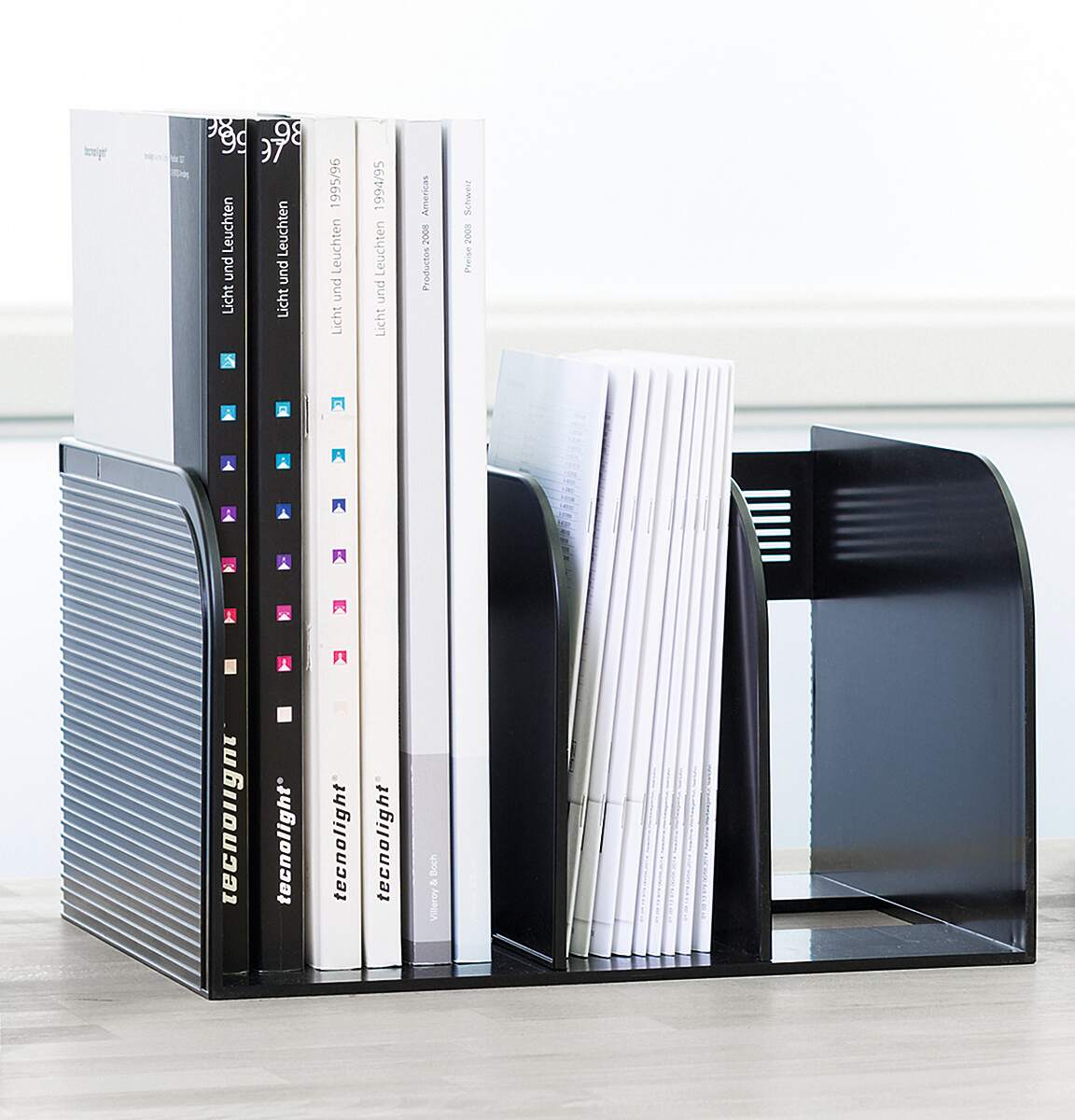 Detta ställ kan användas som katalogställ, bokstöd eller brevställ. Katalogstället OPTIMO är certifierad med den tyska miljömärkningen Blue Angel som ställer höga krav på miljövänlig produktdesign och är sedan 1978 en pålitlig guide för en mer hållbar konsumtion. Polystyrenplasten som detta ställ är tillverkad av består av en hög andel insamlad återvunnen plast samtidigt som den har lång livslängd och är fullt återvinningsbar. Stället har ett 6,5 cm brett fack som kan flyttas steglöst i sidled och på så sätt anpassa bredden på facken runtomkring. Mått: 21,5 x 16,5 x 21 cm (BxHxD)