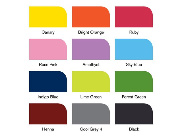 Textfärg: Buttercup, Lemon, Gold, Lipstick red, Cerise, Fuchsia pink, Arctic blue, Cobalt blue, Meadow green, Apple, Turquoise, Cocoa & Blender.