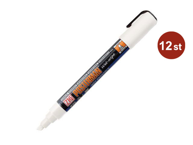 Posterman Wet-Wipe kan enkelt torkas bort med en blöt trasa och har 6.0 mm medium skuren spets. Lämpar sig bäst för inomhusbruk på svarta tavlor/griffel, glasytor och whiteboard. Resultatet liknar krita, men utan kladd, texten blir vattenfast när den har torkat. Perfekt för butiker, restauranger, pubar m.m. Det går bra att skriva på fönster, speglar, keramik, papper, glas, plast, metall, trä, sten och mycket mer. Zig Posterman har ett mycket täckande bläck.