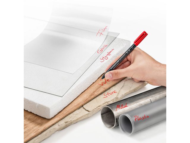 STAEDTLER Lumocolor® 318 permanent märkpenna innehåller ett bläck som inte avger starka lukter och kan användas på nästan vilken yta som helst. Med den här universalpennan går det att skriva på nästan alla ytor, till exempel glas, metall, plast, tyg och OH-film. STAEDTLER Lumocolor® 318 har en tunn spets som ger cirka 0,6 mm linjebredd och den passar utmärkt när du vill ha precision och noggrannhet. Den innehåller ett särskilt bläck som är smetfritt och vattenbeständigt så att du kan skriva permanent text i nästan alla förhållanden. Bläcket torkar inom några sekunder, vilket gör den här märkpennan perfekt för vänsterhänta. Bläcket är dessutom xylen- och toluenfritt, vilket innebär att bläcket luktar mindre. Märkpennan levereras komplett med kork och fickklämma så att den är lätt att alltid ha till hands. Den är dessutom påfyllningsbar och kan lämnas utan kork i flera dagar utan att bläcket torkar ut. - Huv - Den kan användas på nästan alla ytor, till exempel glas, metall, plast, tyg och OH-film - Vattenbeständigt - Fin spets - Linjebredd: Ca 0,6 mm - Enkel att fylla på med påfyllningen 487 17 - Skrivfärg: Svart, Röd, Blå, Grön, Orange och Brun - Färg pennkropp: Grå
