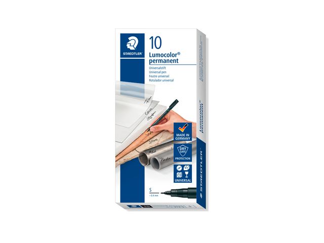 Med den här universalpennan går det att skriva på nästan alla ytor, till exempel glas, metall, plast, tyg och OH-film. STAEDTLER Lumocolor® 313 har en extra tunn spets som ger cirka 0,4 mm linjebredd, vilket passar utmärkt när du vill skriva snyggt och noggrant. Den innehåller ett särskilt bläck som är smetfritt och vattenbeständigt så att du kan skriva permanent text i nästan alla förhållanden. Bläcket torkar inom några sekunder, vilket gör den här märkpennan perfekt för vänsterhänta. Bläcket är dessutom xylen- och toluenfritt, vilket innebär att bläcket luktar mindre. Märkpennan levereras komplett med kork och fickklämma så att den är lätt att alltid ha till hands. DRY SAFE – kan lämnas utan hätta i dagar utan att torka ut. Flygplanssäker - Automatisk tryckutjämning förhindrar att pennan läcker ombord på flygplan.