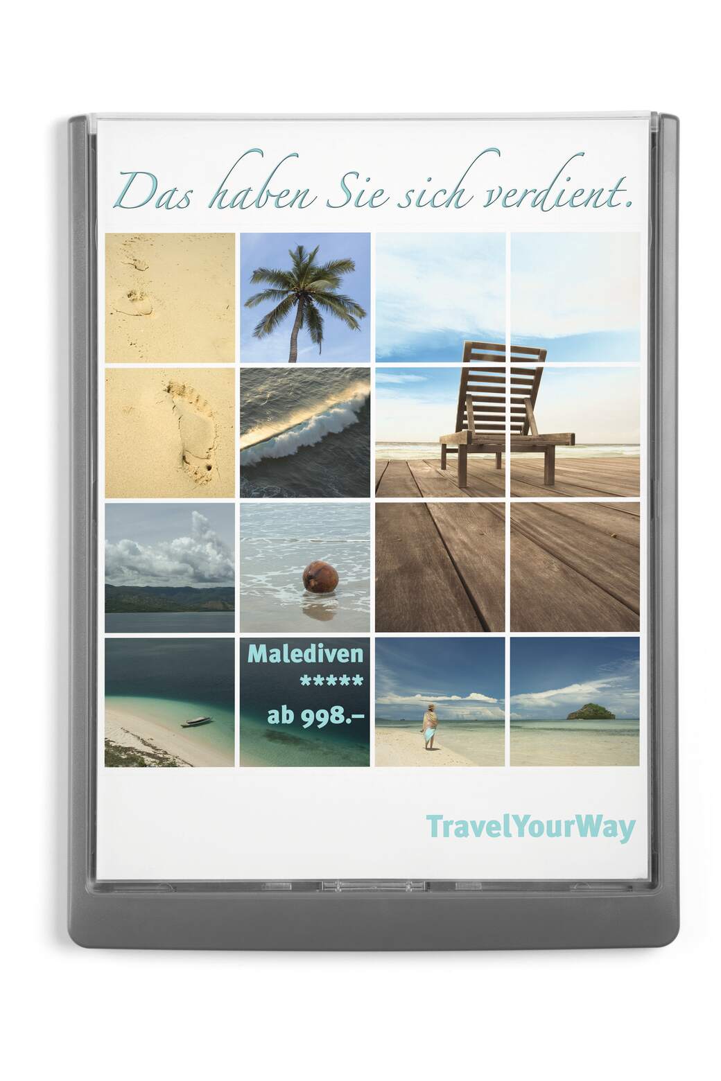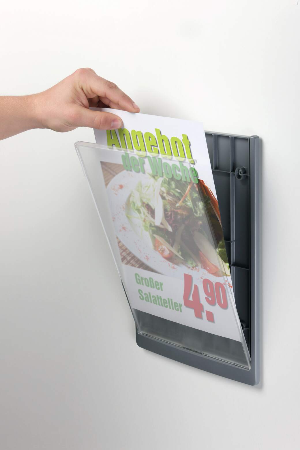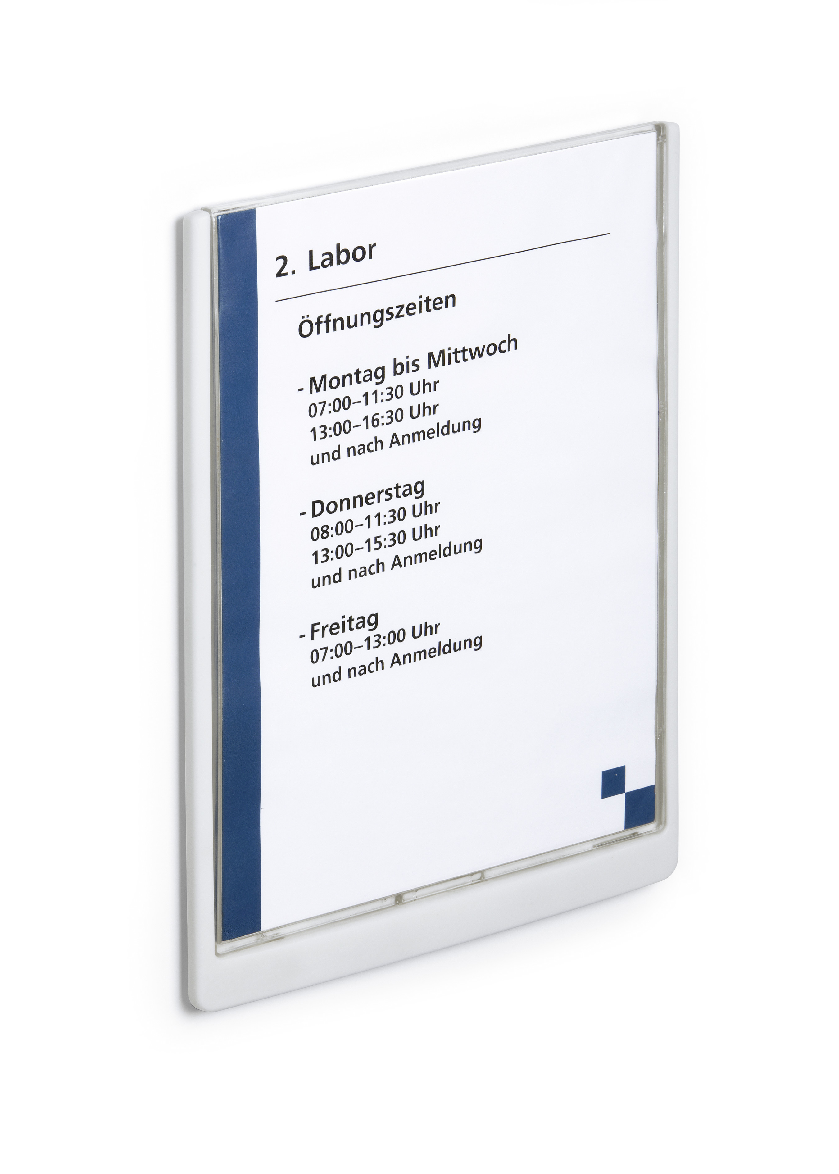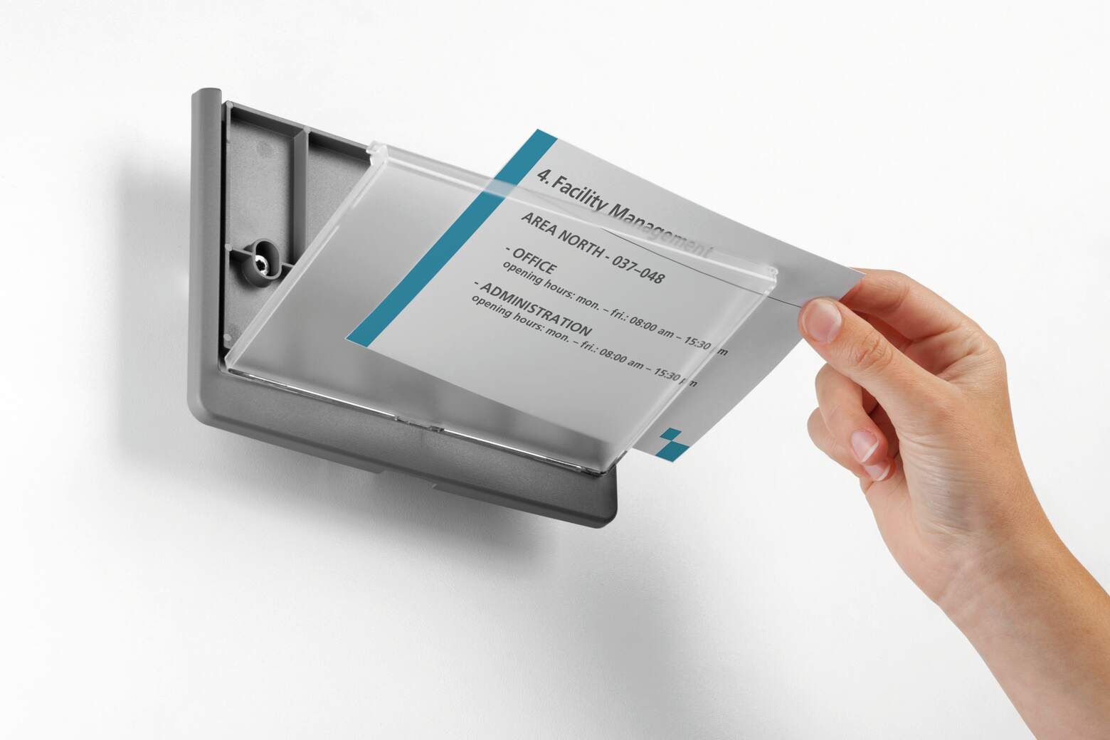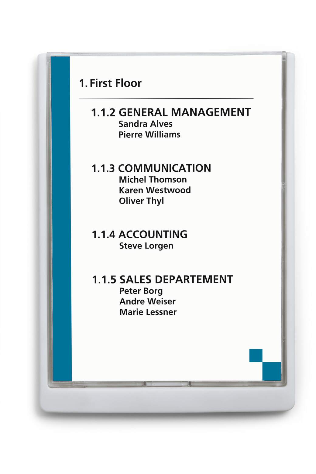 Dörr- och väggskyltar i olika utförande hjälper besökare att orientera sig och informerar om vem, vilken avdelning, funktion eller konferensrum som som finns var i lokalen. Skyltserien CLICK SIGN finns i fyra färger för möjligheten att ha olika färger på olika avdelningar eller våningsplan eller helt enkelt för att det är en färg som passar i verksamheten. CLICK SIGN har en nedfällbar frontskiva som det vita arket med text sitter skyddat bakom. Skruv, plugg och självhäftande remsor ingår i monteringskitet, liksom monteringsanvisning och ett vit insticksskylt. Designa den här stående A4 skylten (210x297) med hjälp av gratisprogrammet DURAPRINT® som finns på www.duraprint.se och skriv ut på A4 ark , som beställs separat. Tillbehör: A4-ark för utskrift i laserskrivare, artikelnummer 485602