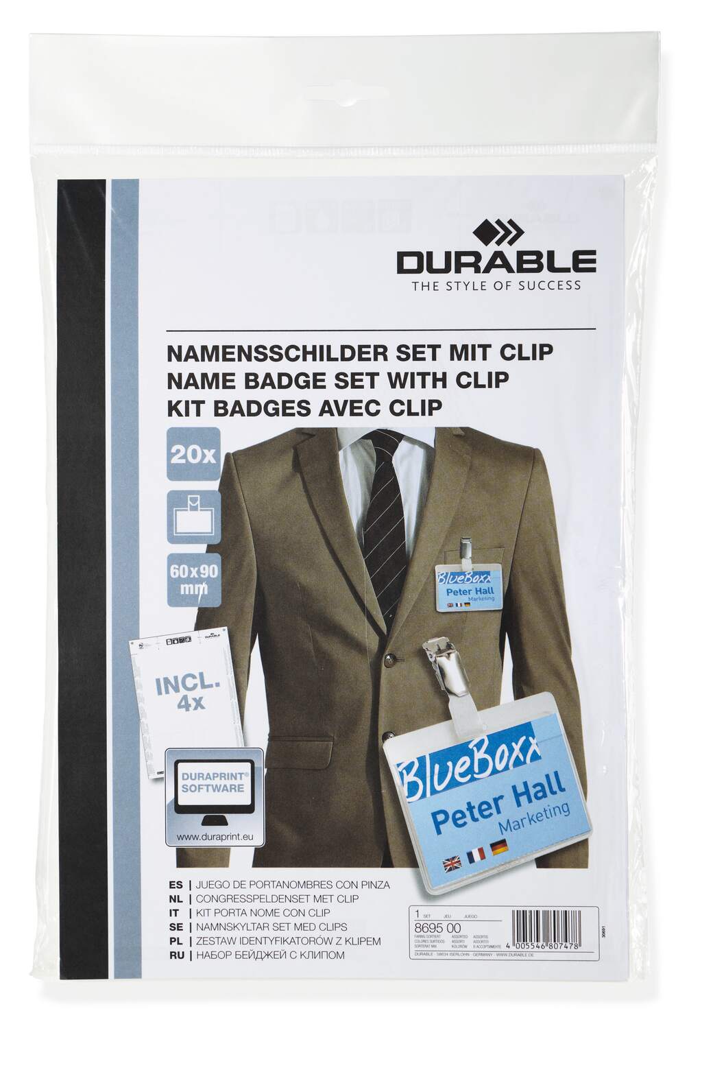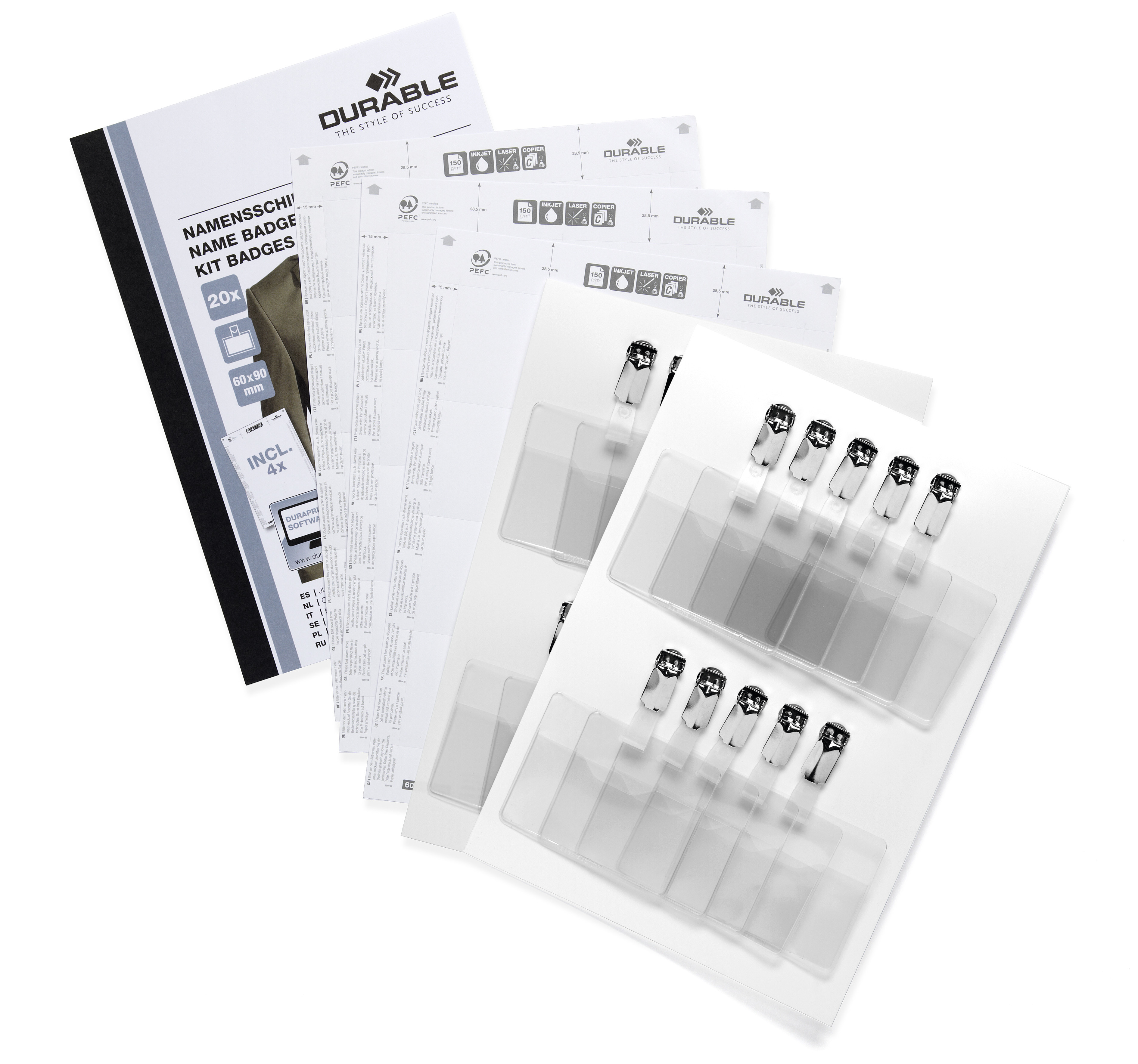 Namnskyltar med clips som är utformade för professionell och tydlig identifiering vid konferenser، event، mässor och i arbetsmiljöer. Förpackningen innehåller 20 namnskyltar och levereras med matchande BADGEMAKER® insticksetiketter för smidig och enhetlig märkning. Tumgreppet gör det enkelt att snabbt byta etiketter vid behov. Den liggande designen ger god läsbarhet och ett representativt intryck.