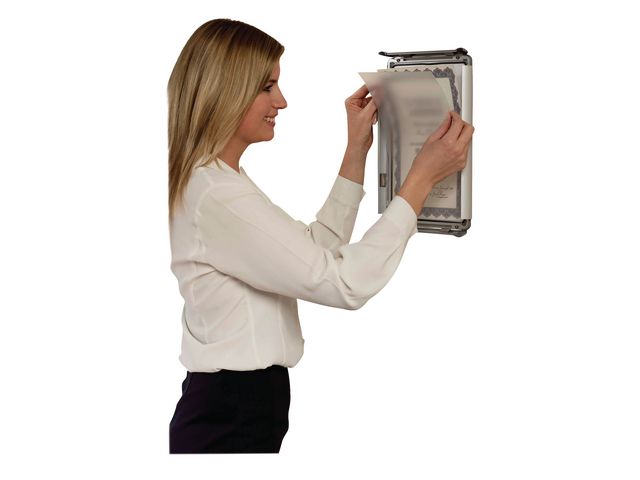 Snäppramar öppnas framtill så att bilderna lätt kan bytas utan att man behöver ta ner ramen från väggen. Idealiska för anslag som ofta byts ut såsom menyer, personalmeddelanden, specialerbjudanden etc. Alla de fyra ramkanterna lyfts upp och bilderna skydd