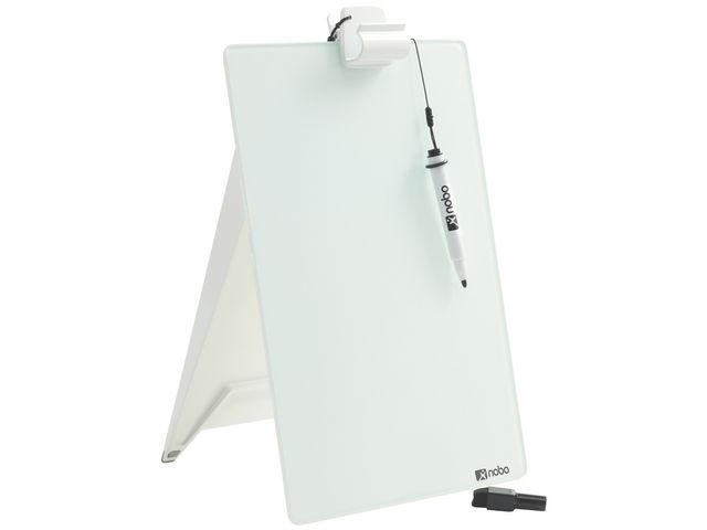 Whiteboardstaffli med glasyta för skrivbord med elegant, modern design med maximal funktion. Staffliets ramfria whiteboardyta har hög motståndskraft mot fläckar och repor. Utmärkt noteringsverktyg, det är bara att skriva, torka, rensa bort och börja om igen. Du kan även använda den praktiska klämman som medföljer för att fästa dokument. En mini Nobo-whiteboardpenna med en taveltorkare på locket medföljer.