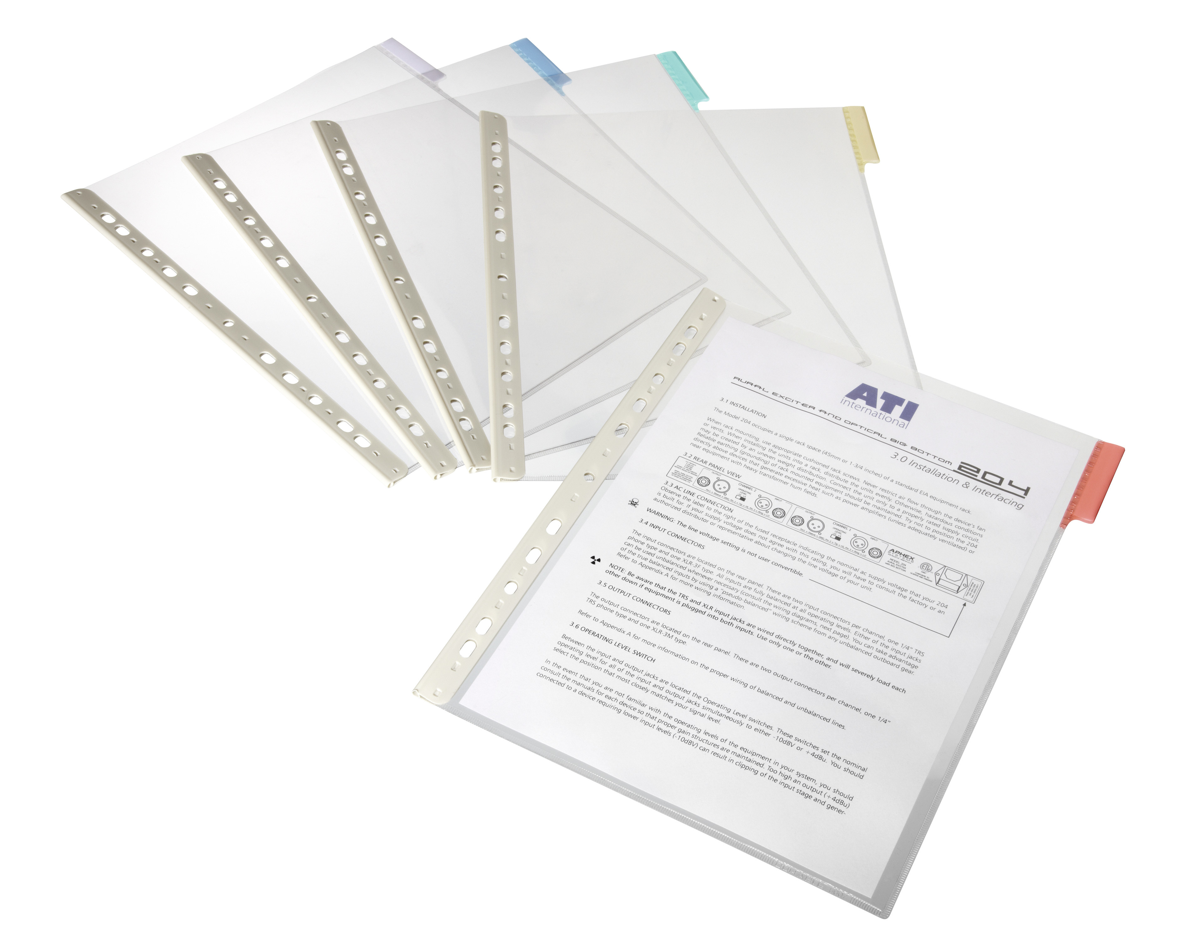 Plastficka med fasta rubrikhållare. Passar för bord och väggställ som har piggarna integrerade i konsolen.