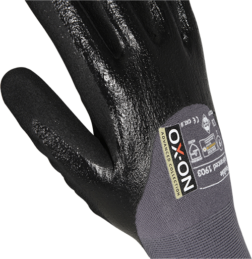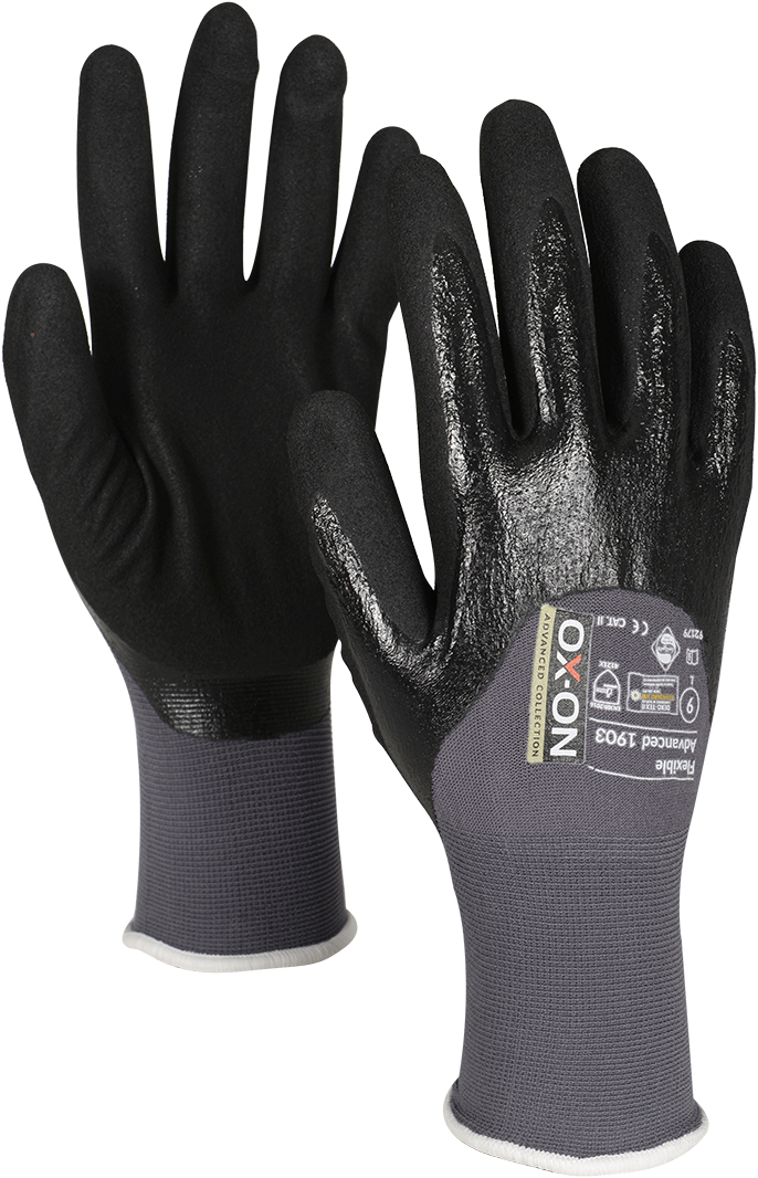 OX-ON Flexible Advanced 1903 är en halvdoppad arbetshandske av högsta kvalitet. Ett extra lager av nitrilbeläggning har lagts på fingrarna och upp till knogarna för att göra handflatan vattentät och oljeavvisande. Extremt slitstark med utsökt passform och hög komfort dag efter dag. Stickad i nylon och elastan för unik andningsförmåga och flexibilitet. Handflatan och fingrarna har specialkvalitets nitrilskum för sublim fingertoppskänsla och säkert grepp. OekoTex-certifierad och Sanitized-behandlad för långvarig hygien och skydd mot bakterier och svettlukt. Kan tvättas upp till 2 gånger i 40°C och torktumlas i låg temperatur utan att förlora egenskaper.