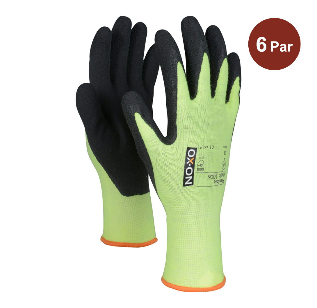Varumärke OX-ON Typ Flexhandskar Serie Flexible Basic 1006 Kategori Arbetshandskar Material Latex Färg Svart/Grön Storlek 08/M, 09/L, 10/XL, 11/2XL Kön Unisex - Produktblad