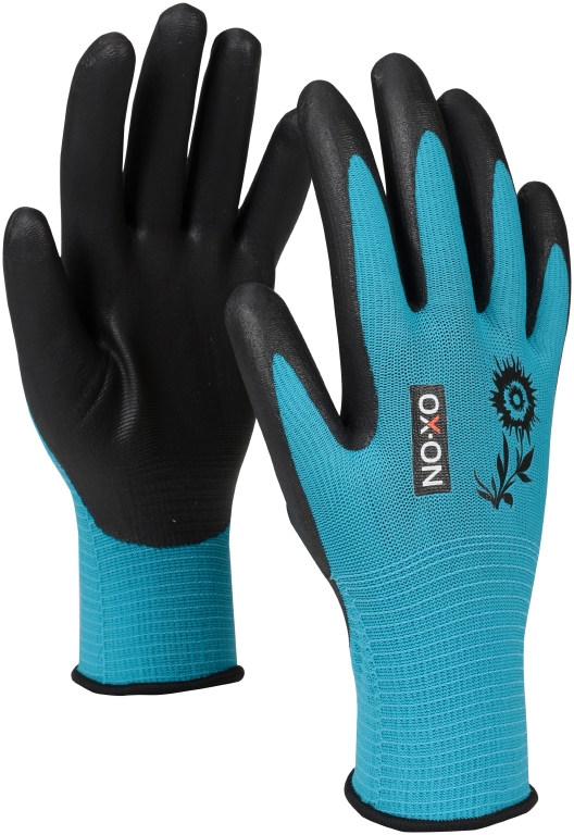 OX-ON Garden Comfort 5302 är en Oeko-Tex®-certifierad trädgårdshandske för alla som uppskattar kvalitet och miljövänliga material. Oeko-Tex®-märkningen ger en försäkran om att handsken är testad för ämnen som är skadliga för hälsa och miljö. Hög kvalitet kan också förväntas av den fingerdoppade polyesterhandsken som ger perfekt passform. Handflatan och fingertopparna är gjorda av nitrilskum för skydd och komfort. Garden Comfort 5302 har en turkosblå rygg med ett enda svart blomtryck. Detta är den mest populära modellen i Garden-serien.