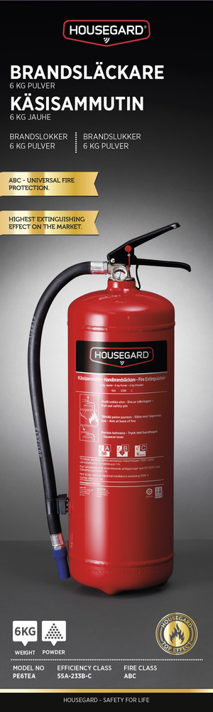 Pulversläckare från Housegard, lämplig för olika typer av fordon och arbetsmiljöer. 2 kg-versionen är anpassad för personbil och husbil och kan komplettera en 6 kg-släckare. 4 kg-versionen passar truck, traktor och industrifordon. 6 kg för kontorsmiljöer, byggarbetsplatser och industrifordon. 12 kg för verksamheter inom industri, verkstad och fartyg. Pulvret släcker bränder i textilier, trä, brännbara vätskor, gas och elektriska installationer och är ett av de mest mångsidiga släckmedlen på marknaden.