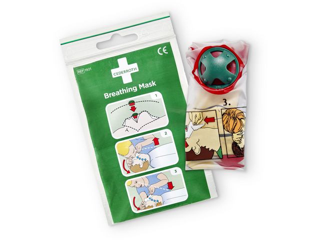 Cederroth Andningsmask är ett hjälpmedel för att ge mun-till-mun-andning på rätt sätt samtidigt som det minskar risken för kontakt mellan hjälpare och skadad. Andningsmasken består av en plastduk med backventil. Tydliga instruktioner är tryckta direkt på duken. På plastduken finns tydliga instruktioner för mun-mot-mun-metoden och hur masken ska placeras över den skadades ansikte. Backventilen signalerar vilken sida som skall placeras upp mot hjälparen (grön) respektive ned i den skadades mun (röd).