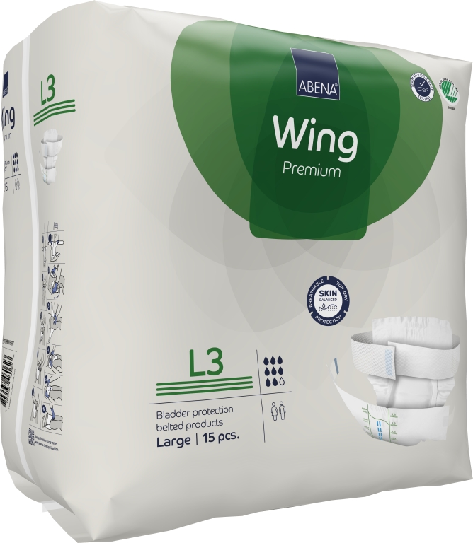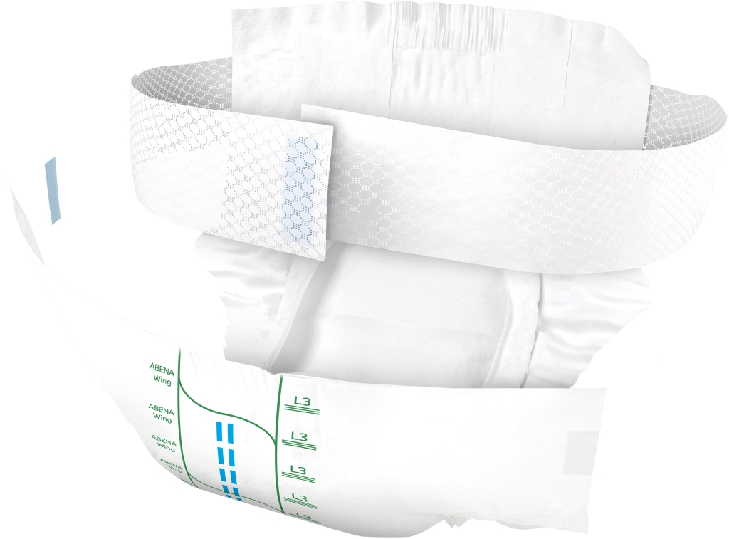 ABENA Wing är vårt förstklassiga sortiment av bältesprodukter för måttlig till kraftig inkontinens. Samtliga produkter är Svanenmärkta. Alla inkontinensprodukter har full andningsförmåga och är utrustade med läckagebarriärer för extra skydd. De dermatologiskt testade produkterna med ABENA:s Top-Dry-teknik skyddar och vårdar huden genom att hålla det exponerade området torrt och behagligt även efter flera läckage. Det mjuka nonwoven-bältet är integrerat i produktens baksida och erbjuder en bra fixeringslösning för alla kroppsformer. Bältet är extra långt, så du behöver inte använda något separat förlängningsbälte. Optimal passform tack vare resårer i både fram- och baksidan. Lättjusterade fästen (kardborreband på bältet och kombitejp på produkten) som kan flyttas flera gånger. Den unika passformen gör ABENA Wing till en utmärkt lösning för vårdtagare som kan klara sig själva. Med hjälp av våtindikatorn och rutsystemet kan användare och vårdgivare hitta den produkt som har rätt absorptionsnivå, vilket också underlättar vid byten. Odörsystemet minskar risken för oönskad lukt.