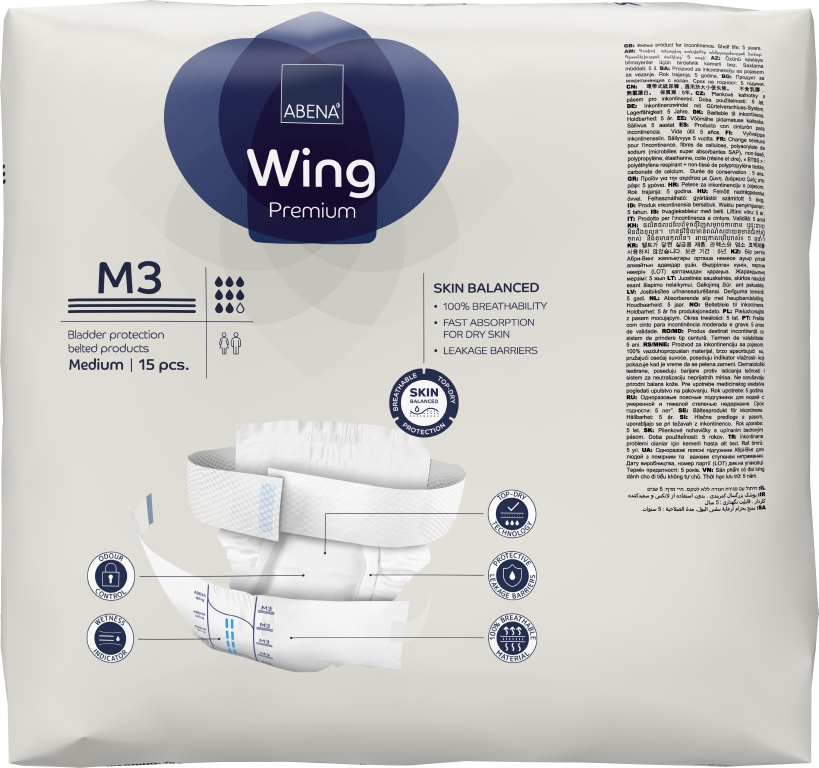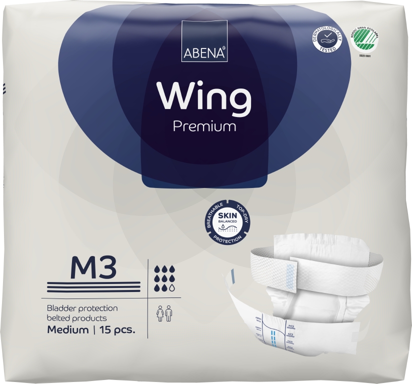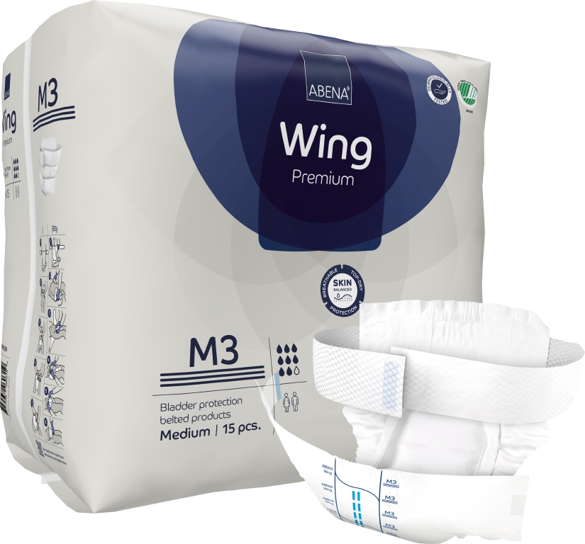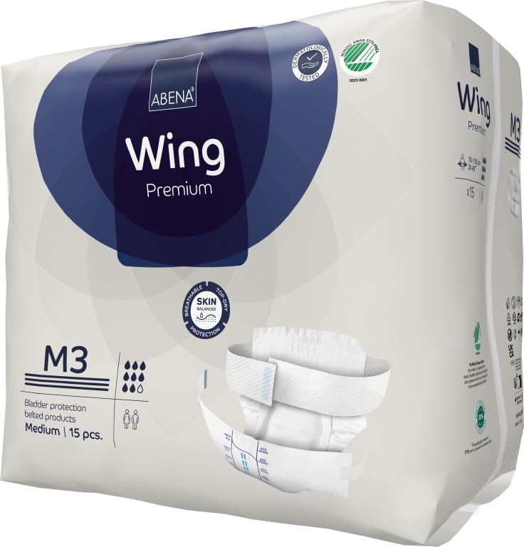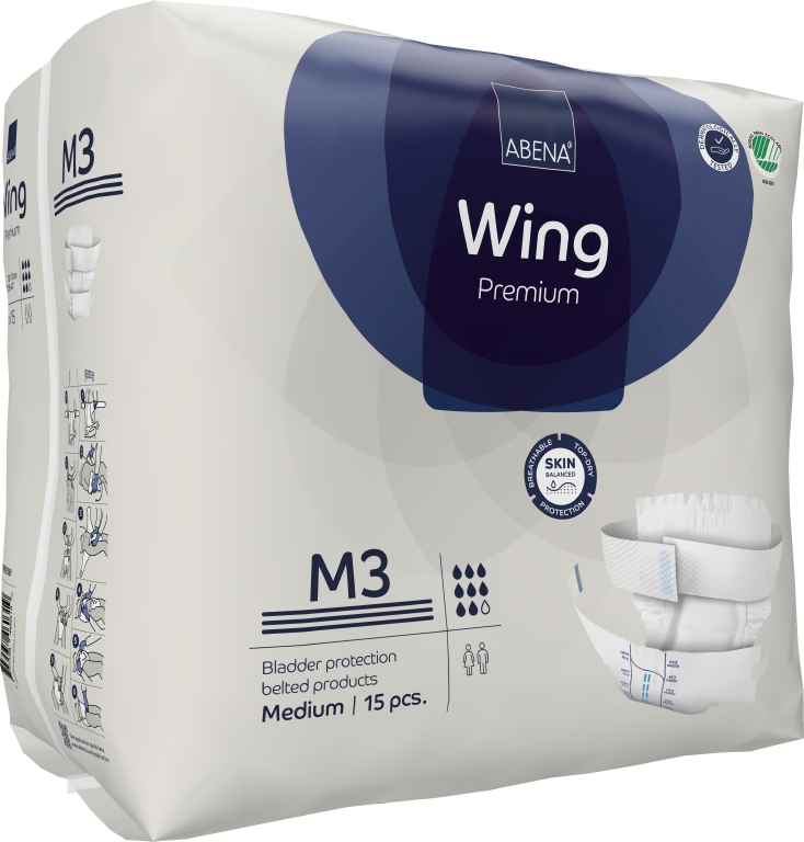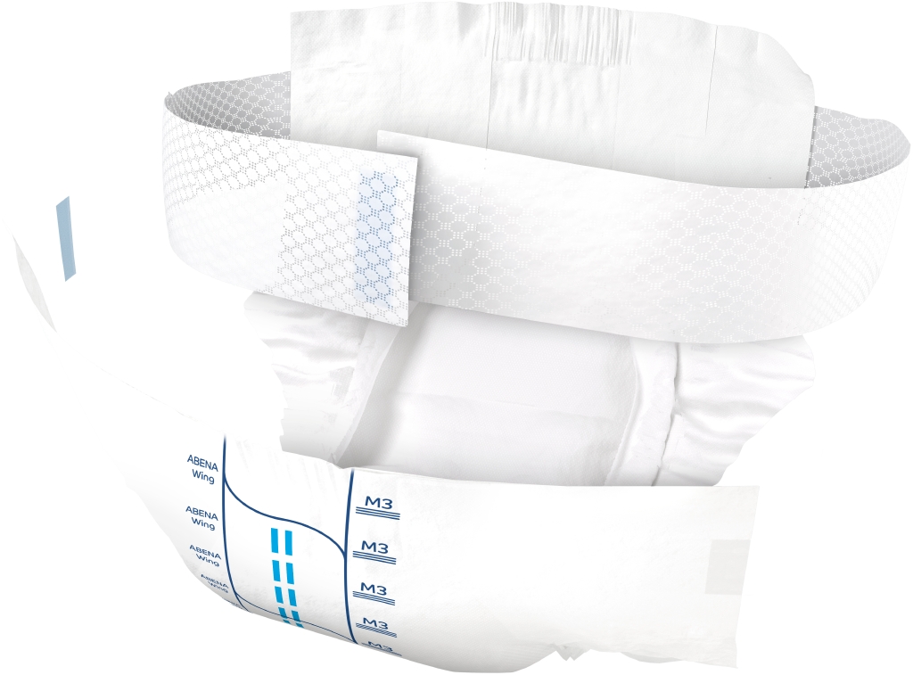 ABENA Wing är vårt förstklassiga sortiment av bältesprodukter för måttlig till kraftig inkontinens. Samtliga produkter är Svanenmärkta. Alla inkontinensprodukter har full andningsförmåga och är utrustade med läckagebarriärer för extra skydd. De dermatologiskt testade produkterna med ABENA:s Top-Dry-teknik skyddar och vårdar huden genom att hålla det exponerade området torrt och behagligt även efter flera läckage. Det mjuka nonwoven-bältet är integrerat i produktens baksida och erbjuder en bra fixeringslösning för alla kroppsformer. Bältet är extra långt, så du behöver inte använda något separat förlängningsbälte. Optimal passform tack vare resårer i både fram- och baksidan. Lättjusterade fästen (kardborreband på bältet och kombitejp på produkten) som kan flyttas flera gånger. Den unika passformen gör ABENA Wing till en utmärkt lösning för vårdtagare som kan klara sig själva. Med hjälp av våtindikatorn och rutsystemet kan användare och vårdgivare hitta den produkt som har rätt absorptionsnivå, vilket också underlättar vid byten. Odörsystemet minskar risken för oönskad lukt.