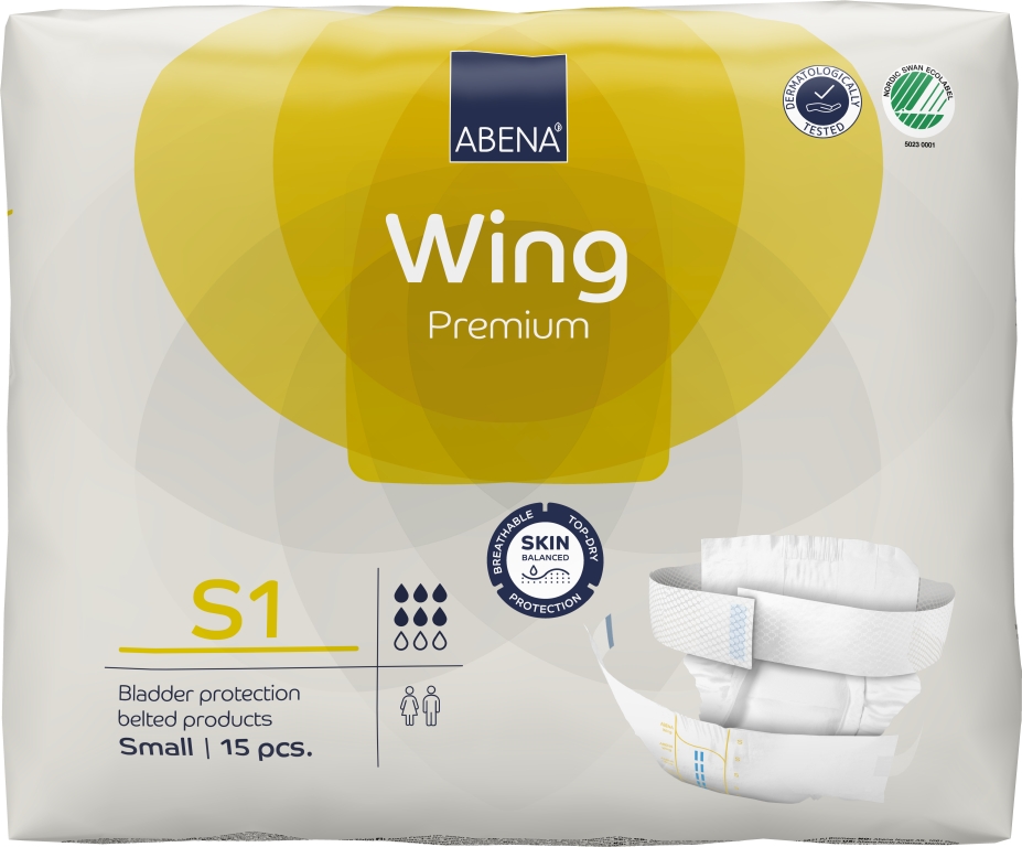 ABENA Wing är vårt förstklassiga sortiment av bältesprodukter för måttlig till kraftig inkontinens. Samtliga produkter är Svanenmärkta. Alla inkontinensprodukter har full andningsförmåga och är utrustade med läckagebarriärer för extra skydd. De dermatologiskt testade produkterna med ABENA:s Top-Dry-teknik skyddar och vårdar huden genom att hålla det exponerade området torrt och behagligt även efter flera läckage. Det mjuka nonwoven-bältet är integrerat i produktens baksida och erbjuder en bra fixeringslösning för alla kroppsformer. Bältet är extra långt, så du behöver inte använda något separat förlängningsbälte. Optimal passform tack vare resårer i både fram- och baksidan. Lättjusterade fästen (kardborreband på bältet och kombitejp på produkten) som kan flyttas flera gånger. Den unika passformen gör ABENA Wing till en utmärkt lösning för vårdtagare som kan klara sig själva. Med hjälp av våtindikatorn och rutsystemet kan användare och vårdgivare hitta den produkt som har rätt absorptionsnivå, vilket också underlättar vid byten. Odörsystemet minskar risken för oönskad lukt.