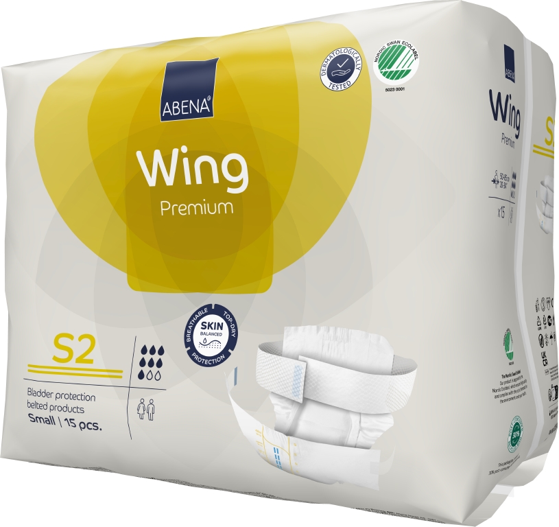 ABENA Wing är vårt förstklassiga sortiment av bältesprodukter för måttlig till kraftig inkontinens. Samtliga produkter är Svanenmärkta. Alla inkontinensprodukter har full andningsförmåga och är utrustade med läckagebarriärer för extra skydd. De dermatologiskt testade produkterna med ABENA:s Top-Dry-teknik skyddar och vårdar huden genom att hålla det exponerade området torrt och behagligt även efter flera läckage. Det mjuka nonwoven-bältet är integrerat i produktens baksida och erbjuder en bra fixeringslösning för alla kroppsformer. Bältet är extra långt, så du behöver inte använda något separat förlängningsbälte. Optimal passform tack vare resårer i både fram- och baksidan. Lättjusterade fästen (kardborreband på bältet och kombitejp på produkten) som kan flyttas flera gånger. Den unika passformen gör ABENA Wing till en utmärkt lösning för vårdtagare som kan klara sig själva. Med hjälp av våtindikatorn och rutsystemet kan användare och vårdgivare hitta den produkt som har rätt absorptionsnivå, vilket också underlättar vid byten. Odörsystemet minskar risken för oönskad lukt.