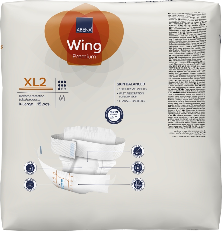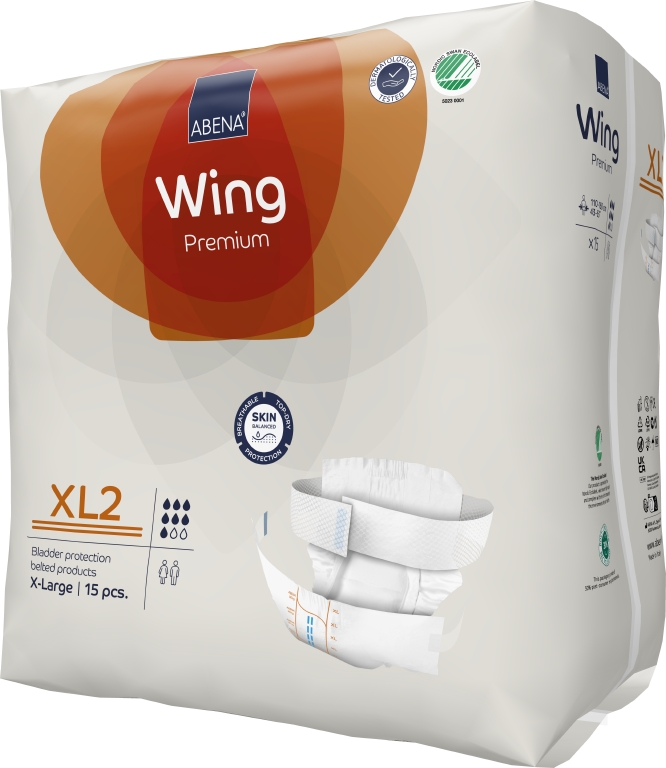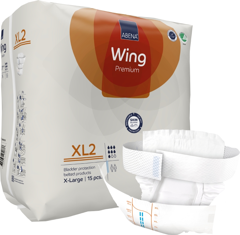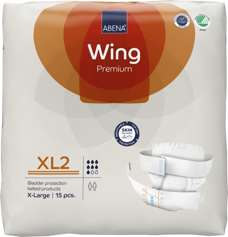 ABENA Wing är vårt förstklassiga sortiment av bältesprodukter för måttlig till kraftig inkontinens. Samtliga produkter är Svanenmärkta. Alla inkontinensprodukter har full andningsförmåga och är utrustade med läckagebarriärer för extra skydd. De dermatologiskt testade produkterna med ABENA:s Top-Dry-teknik skyddar och vårdar huden genom att hålla det exponerade området torrt och behagligt även efter flera läckage. Det mjuka nonwoven-bältet är integrerat i produktens baksida och erbjuder en bra fixeringslösning för alla kroppsformer. Bältet är extra långt, så du behöver inte använda något separat förlängningsbälte. Optimal passform tack vare resårer i både fram- och baksidan. Lättjusterade fästen (kardborreband på bältet och kombitejp på produkten) som kan flyttas flera gånger. Den unika passformen gör ABENA Wing till en utmärkt lösning för vårdtagare som kan klara sig själva. Med hjälp av våtindikatorn och rutsystemet kan användare och vårdgivare hitta den produkt som har rätt absorptionsnivå, vilket också underlättar vid byten. Odörsystemet minskar risken för oönskad lukt.