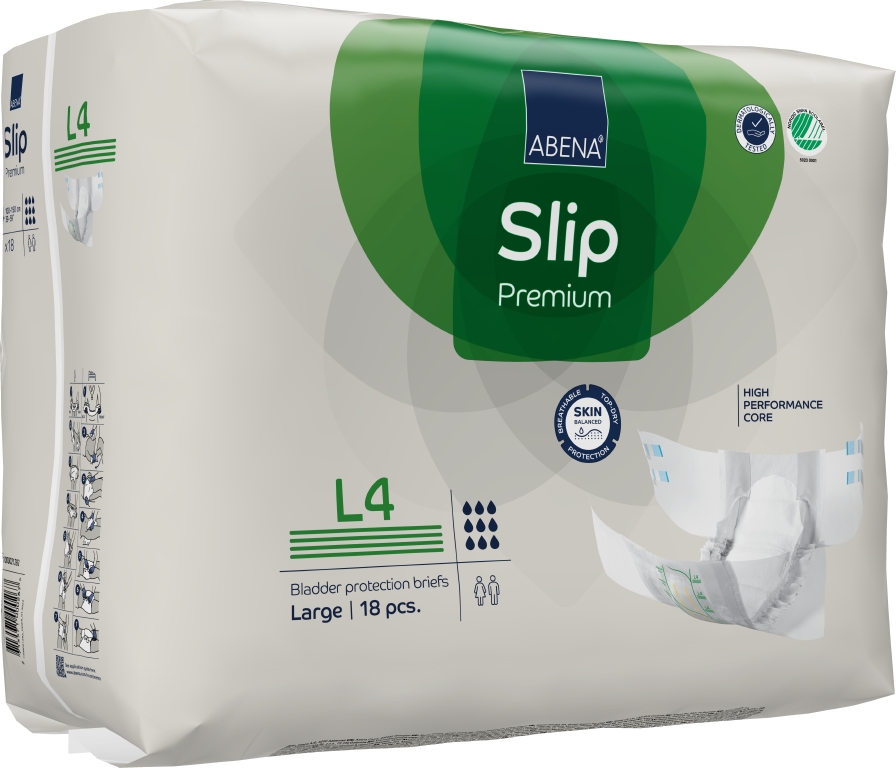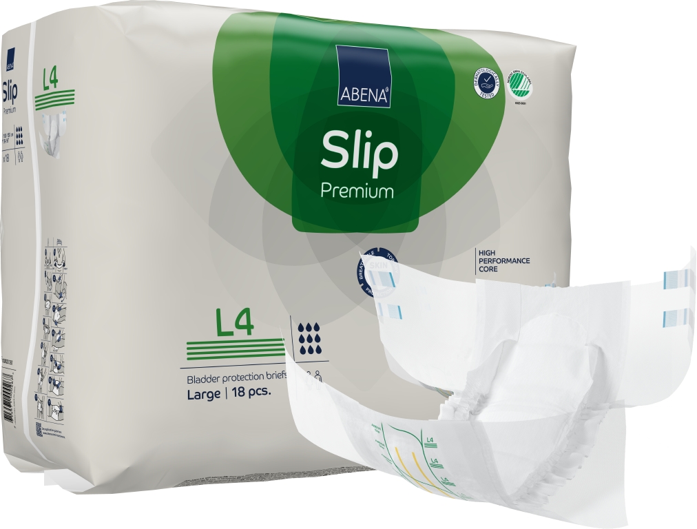ABENA Slip är vårt förstklassiga sortiment av helt andningsbara och anatomiskt formade allt-i-ett-skydd med tejp mot läckage i samband med måttlig till kraftig inkontinens. Den högeffektiva kärnan med Top-Dry-teknik skapar snabb absorption och en torr yta även efter flera läckage. En kombination av olika barriärer (synliga och osynliga) och resårer (böjda benresår) ger 360-graders läckageskydd runt hela produkten. Tillsammans hjälper dessa funktioner till att skydda huden och bibehålla naturlig pH-balans i huden. Odörsystemet minskar risken för oönskad lukt. Den elastiska kombitejpen håller hög kvalitet med dubbel tejpfunktion och gör det enkelt att justera skyddet tills det sitter säkert och bekvämt. Med hjälp av våtindikatorn och rutsystemet kan användare och vårdgivare hitta den produkt som har rätt absorptionsnivå, vilket också underlättar vid byten. Produkterna är dermatologiskt testade och bär det nordiska Svanenmärket.