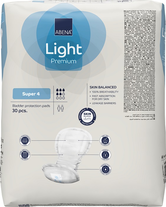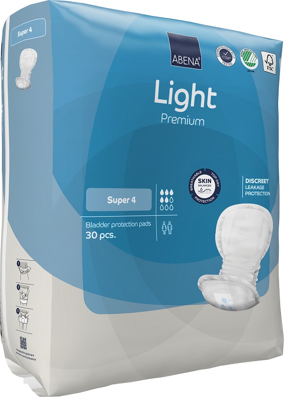 ABENA Light är vårt förstklassiga sortiment av kroppsformade skydd mot urinläckage vid lätt till måttlig inkontinens med självhäftande tejp. Den högeffektiva kärnan med Top-Dry-teknik skyddar och vårdar huden genom att hålla det exponerade området torrt och behagligt även efter flera läckage. Skydden har full andningsförmåga med osynliga, tvärgående läckagebarriärer eller en skålformad design med kanter i elastiskt skum som ger extra skydd mot läckage. Tillsammans skapar de här tre funktionerna – andningsförmåga, skydd och Top-Dry – frisk och balanserad hud och upprätthåller en naturlig pH-balans. Odörsystemet minskar risken för oönskad lukt. De dermatologiskt testade produkterna är Svanenmärkta och tillverkade av FSC-certifierade material.