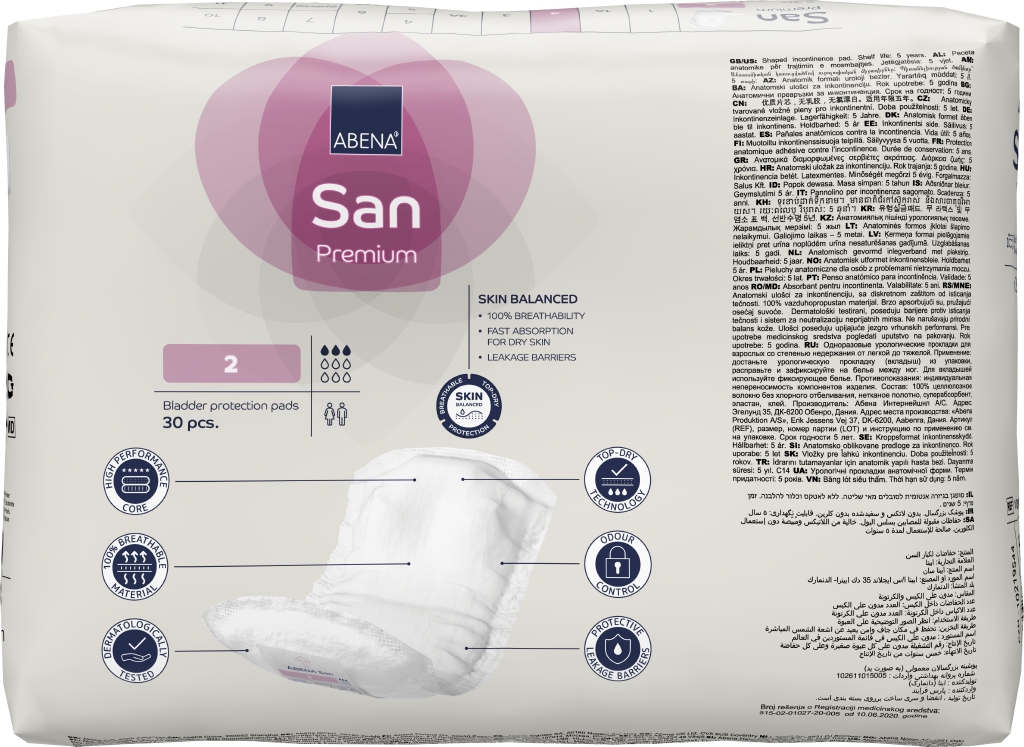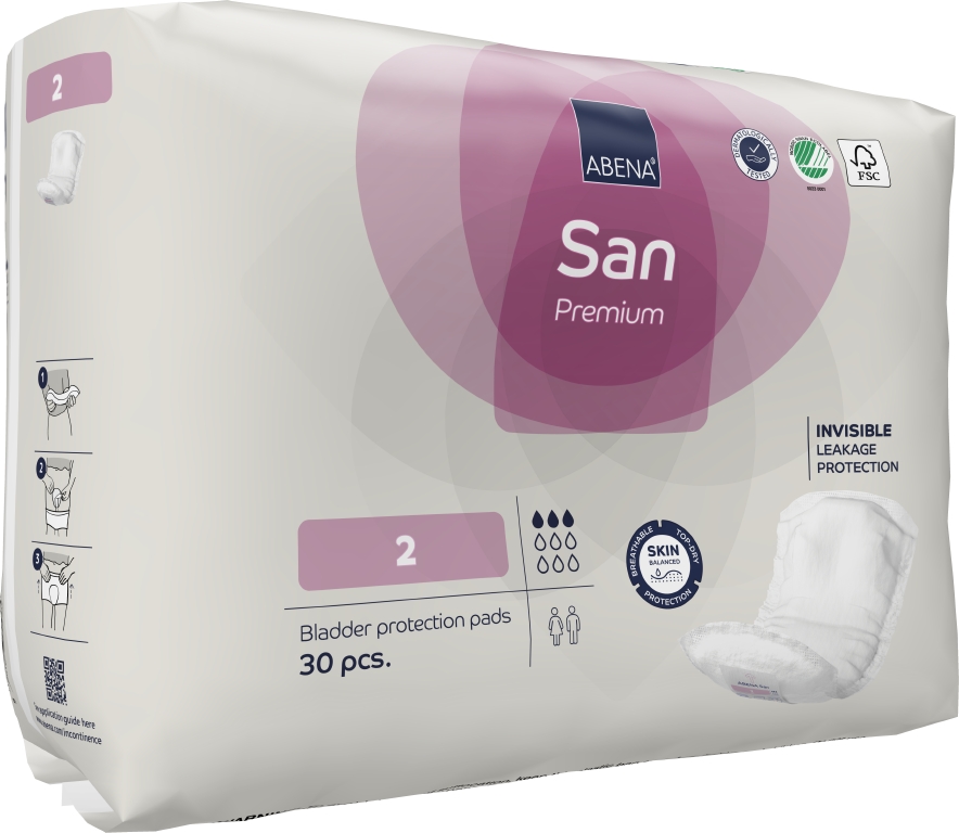ABENA San 1-4 är vårt förstklassiga sortiment av kroppsformade skydd mot urinläckage vid lätt till måttlig inkontinens med självhäftande tejp. Den högeffektiva kärnan med Top-Dry-teknik skapar snabb absorption och en torr yta även efter flera läckage. Alla produkter har full andningsförmåga och är utrustade med osynliga läckagebarriärer för extra skydd. Tillsammans hjälper dessa funktioner till att skydda huden och bibehålla naturlig pH-balans i huden. Odörsystemet minskar risken för oönskad lukt. De dermatologiskt testade produkterna är Svanenmärkta och tillverkade av FSC-certifierade material.