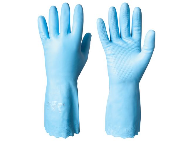 Handskarna, som är tillverkade av vinyl, har goda isolerande egenskaper och skyddar händerna från kemikalier, inklusive blekmedel.