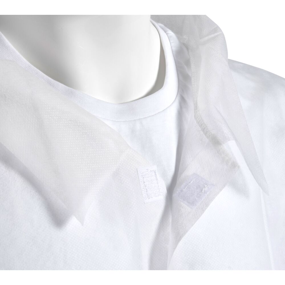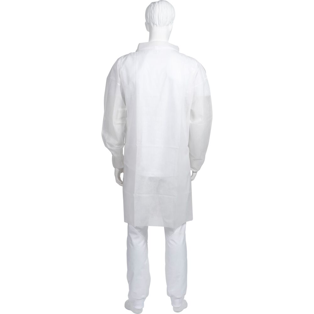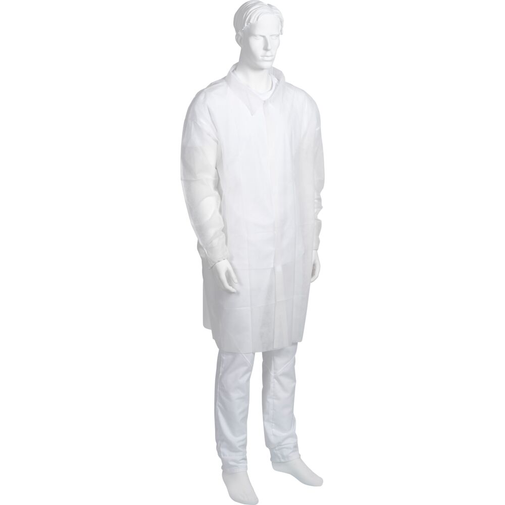 Används som skydd mot infektioner, bakterier och smuts, ex.vis vid fabriksbesök där hög hygienisk standard krävs. Med tryckknappar fram. Ingen elastik i ärmarna. Med kardborreknäppning L/XL.