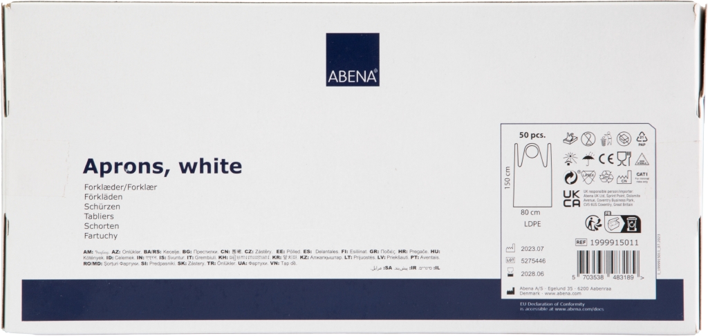 Varumärke Abena EAN 5703538483196 Typ Förkläden Kategori Skyddskläder Material LDPE Färg Vit Tjocklek 20 my Antal st/fp 50 Antal fp/krt 9 Storlek 80 x 150 cm Användning För användaren där hög hygienisk standard behövs - Produktblad
