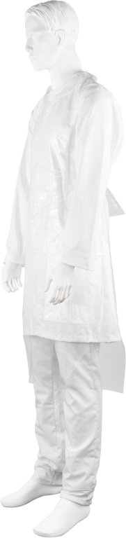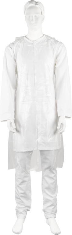 Engångsförkläde av plast, i förpackning. Förpackningen passar i hållare för handskar. Används som skydd för användaren där hög hygienisk standard behövs, t.ex. Inom hälso- och sjukvårdssektorn, vid livsmedelsproduktion, under produktion eller vid förpackning av varor.