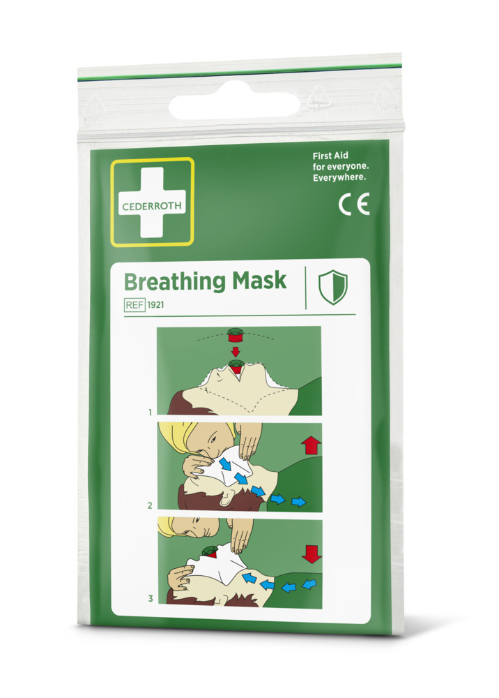 Cederroth Andningsmask är ett hjälpmedel för att ge mun-till-mun-andning på rätt sätt samtidigt som det minskar risken för kontakt mellan hjälpare och skadad. Andningsmasken består av en plastduk med backventil. Tydliga instruktioner är tryckta direkt på duken. På plastduken finns tydliga instruktioner för mun-mot-mun-metoden och hur masken ska placeras över den skadades ansikte. Backventilen signalerar vilken sida som skall placeras upp mot hjälparen (grön) respektive ned i den skadades mun (röd).