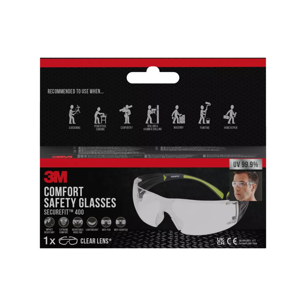 Använd 3M SecureFit 400 Skyddsglasögon när du vill ha ett bekvämt ögonskydd i omslutande modell. De transparenta skyddsglasögonen som väger bara 19 g har skalmar med vaddering ovanför öronen och en mjuk, justerbar näsbrygga .