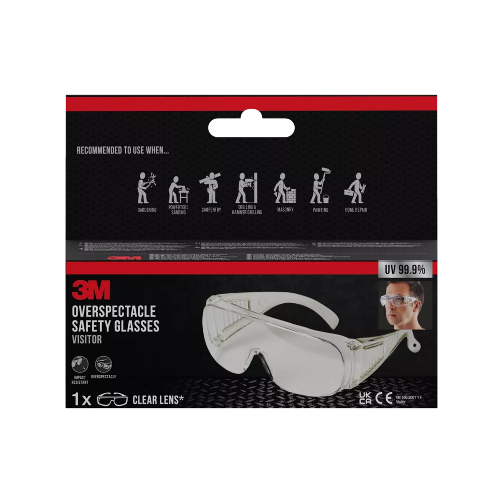 3M Visitor skyddsglasögon är lätta och bekväma att bära över vanliga glasögon. De har transparenta, reptåliga linser av robust polykarbonat och integrerade skydd vid panna och sidor för maximalt ögonskydd. Glasögonen väger endast 39 g och passar både män och kvinnor.