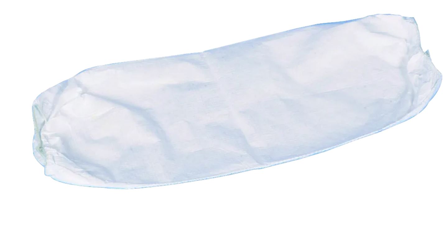 Ärmskydd i vitt antistatiskt tyg. Förpackad med 100 st. per påse. Resår i båda ändar. Mått: 56x23 cm.
