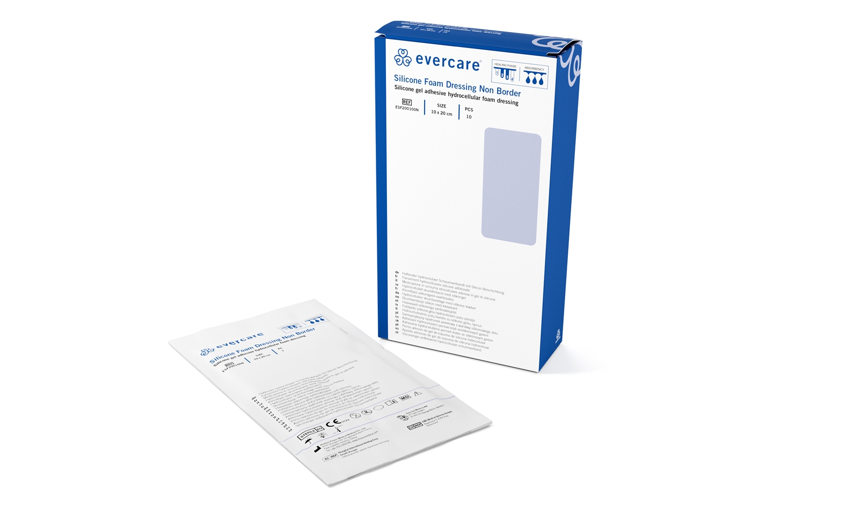 evercare® Silikon Skumförband Non-Border är ett avancerat sårförband med en innovativ trelagersstruktur för optimal sårläkning. Det mjuka silikonlagret ger en skonsam men säker vidhäftning mot huden, medan det absorberande polyuretanskummet effektivt hanterar exsudat. Det yttersta skiktet består av en ånggenomsläpplig men vattentät polyuretanfilm, vilket skyddar såret samtidigt som en fuktig sårmiljö bibehålls.