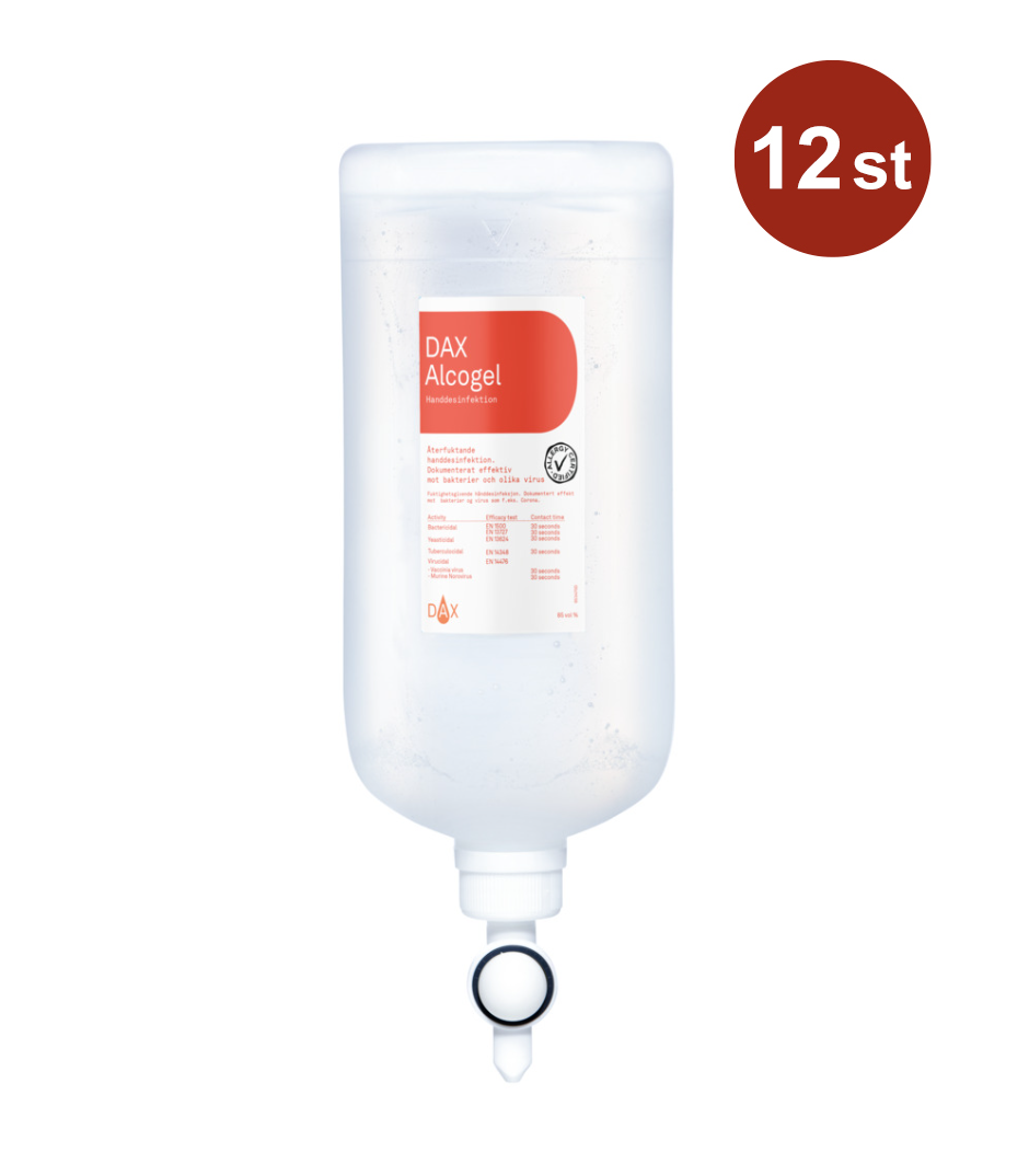 DAX Alcogel är avsedd för effektiv desinfektion av händer och är etanolbaserad med ca 85% alkoholhalt. Produkten är effektiv mot bakterier och många typer av virus, inklusive förkylningsvirus, influensavirus och vinterkräksjuka. Innehåller glycerin som återfuktar huden och förhindrar uttorkning.