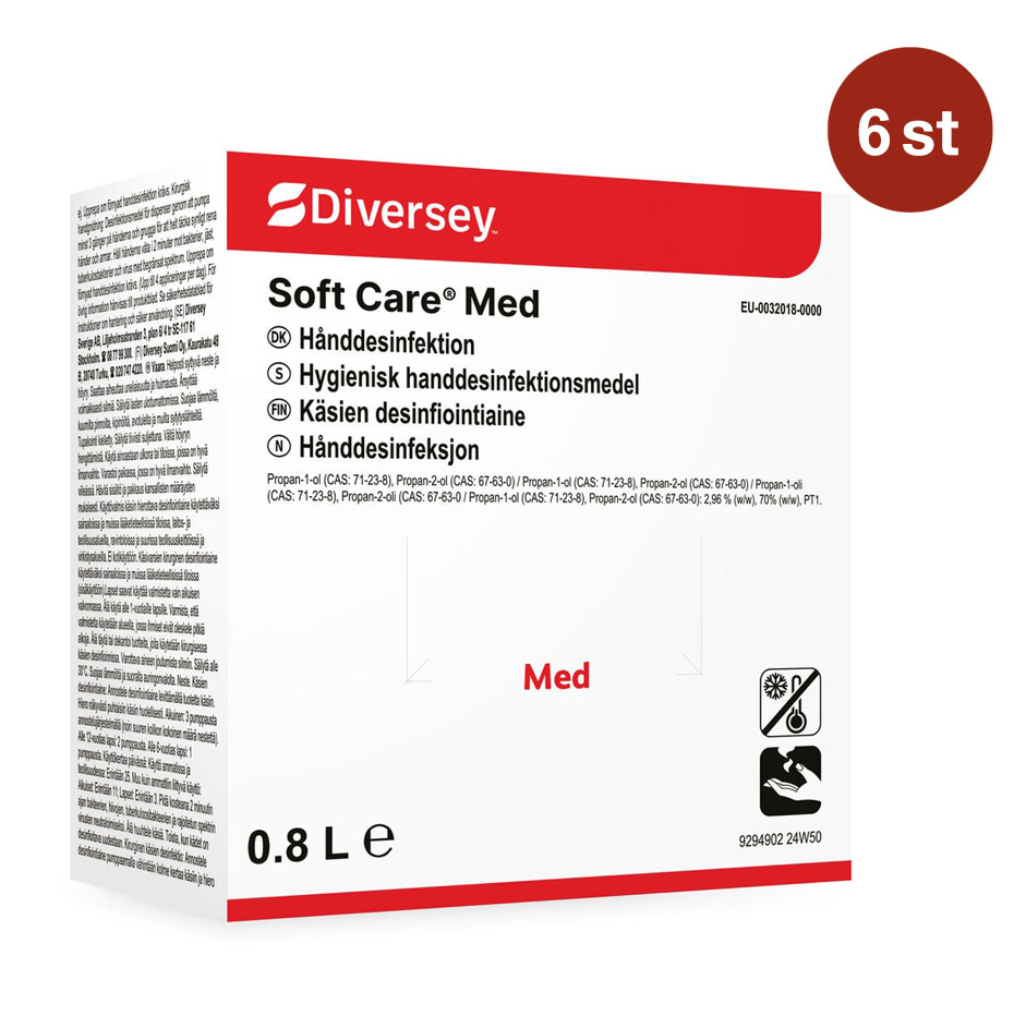 Soft Care MED är en BPR-godkänd alkoholbaserad, bruksfärdig handdesinfektionsgel för professionell användning inom sjukvård, livsmedelsindustri, restauranger, storkök, institutioner och offentliga miljöer. Produkten innehåller en effektiv kombination av isopropylalkohol och n-propanol med en total alkoholhalt på 72,22 % som ger snabb och pålitlig desinfektion av huden. Den är parfymfri, färgfri och dermatologiskt testad samt innehåller fuktgivande ämnen för att skydda huden vid frekvent användning.
