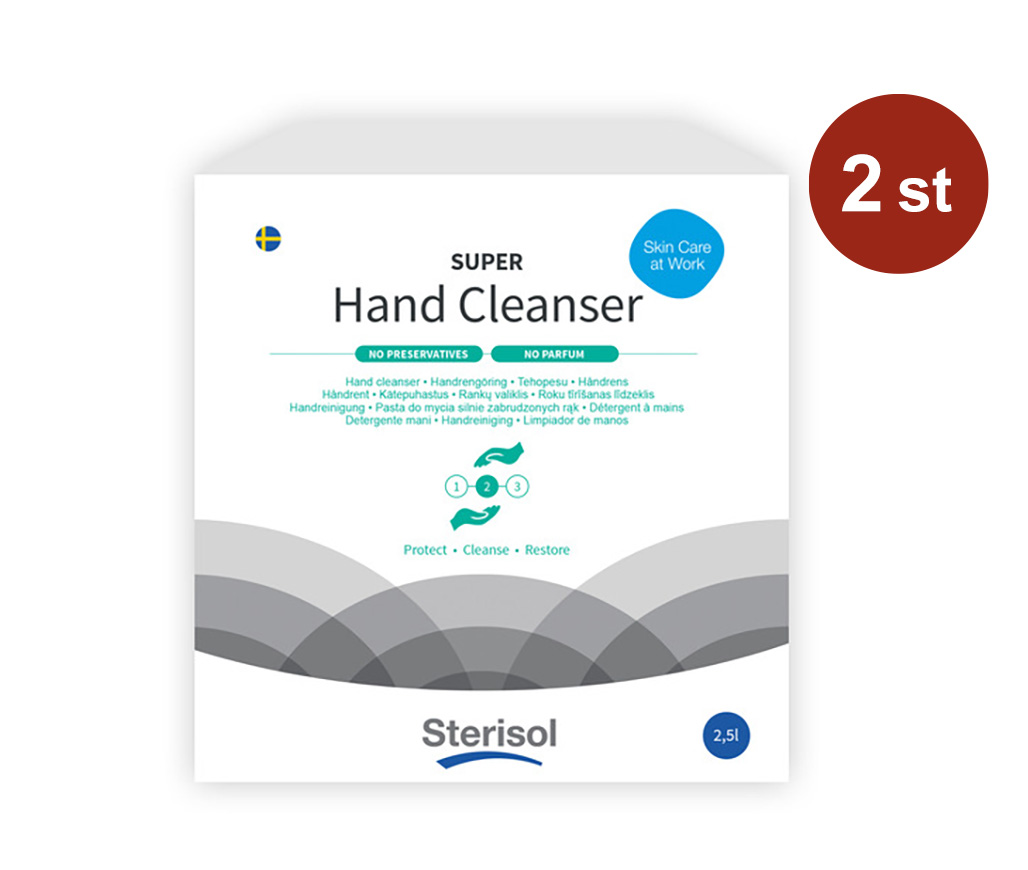 Sterisol SUPER Hand Cleanser är en skonsam handrengöring, som inte skadar hudens normala barriärfunktion. Den innehåller vegetabiliska oljor, som både löser smuts och återfettar huden. Sterisol SUPER innehåller majs som friktionsmedel och är mycket effektiv mot besvärlig smuts. Oparfymerad.
