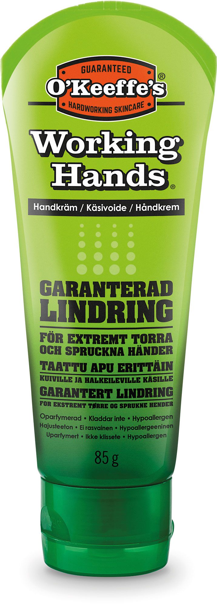 En handkräm för dig som jobbar mycket med händerna. O’Keeffe’s Working Hands är en handkräm som effektivt mjukar upp torra händer som lätt får sprickor. Den doftfria krämen stimulerar hudens naturliga reparationsprocess genom återfuktning, justerar pH-balansen och hjälper huden att bibehålla fukten.