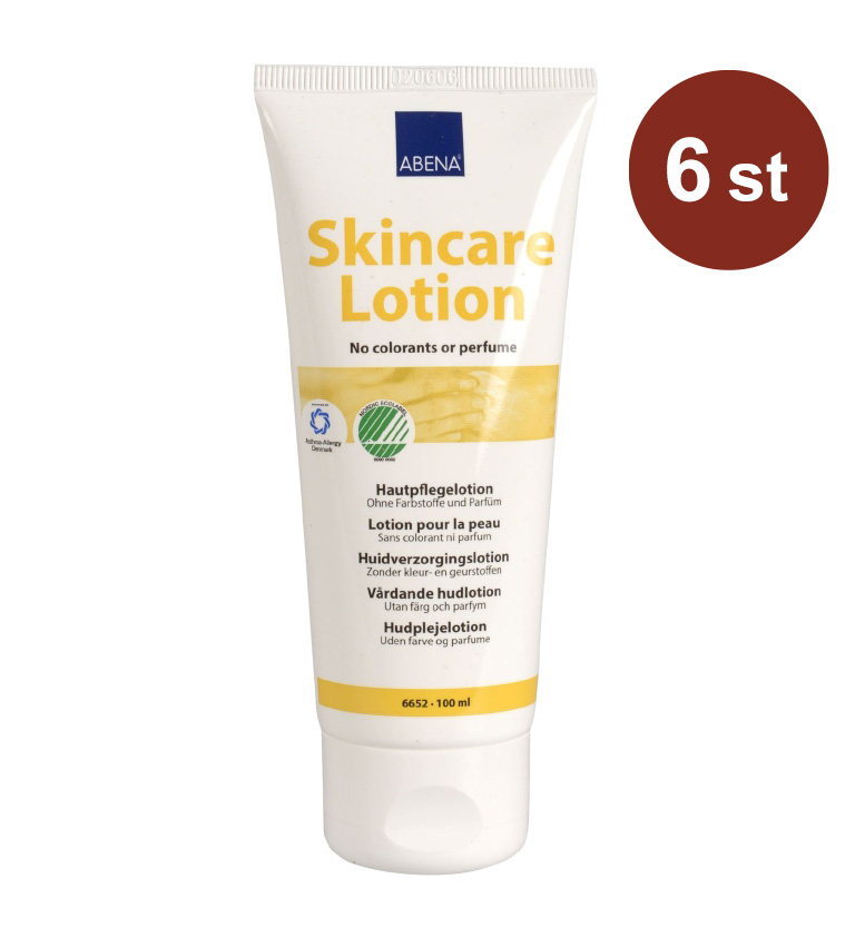 ABENA Hudlotion för normal till torr hud är en lätt återfuktande lotion för daglig användning. Kan användas på händer, kropp och ansikte. Hudlotionen absorberas snabbt av huden och är inte fet. Innehåller återfuktande och mjukgörande ingredienser. Tester har visat att ABENA Hudlotion ger betydande återfuktning i upp till 8 timmar. Krämen innehåller olusolja och sheasmör, som är känt för sina återfuktande och närande egenskaper. Hudlotion utan parfym innehåller antingen 14 % eller 28 % fett. Applicera och smörj in försiktigt. Dosera efter behov. Den här produkten får endast användas utvärtes på kroppen. Undvik kontakt med ögonen