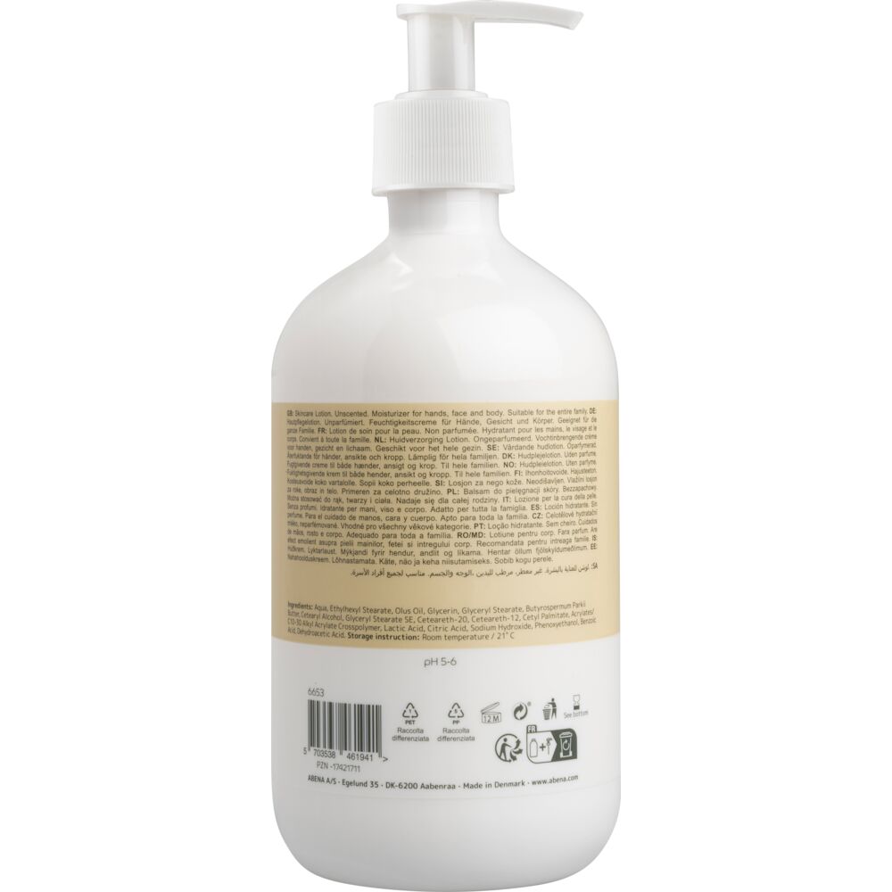 ABENA Hudlotion för normal till torr hud är en lätt återfuktande lotion för daglig användning. Kan användas på händer, kropp och ansikte. Hudlotionen absorberas snabbt av huden och är inte fet. Innehåller återfuktande och mjukgörande ingredienser. Tester har visat att ABENA Hudlotion ger betydande återfuktning i upp till 8 timmar. Krämen innehåller olusolja och sheasmör, som är känt för sina återfuktande och närande egenskaper. Hudlotion utan parfym innehåller antingen 14 % eller 28 % fett. Applicera och smörj in försiktigt. Dosera efter behov. Den här produkten får endast användas utvärtes på kroppen. Undvik kontakt med ögonen.
