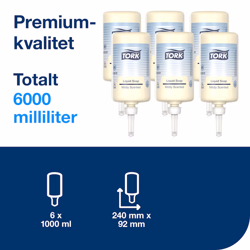 Varumärke Tork EAN 7322540394085 Typ Handtvål Färg Gul Antal st/krt 6 Volym 1 L Utförande Dispensertvål Parfymerad Ja System S1 - Tork - Produktblad
