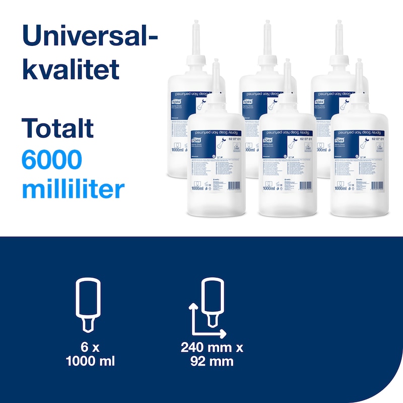 Varumärke Tork EAN 7322540751307 Typ Flytande Tvål, Dispensertvål Färg Transparent Antal st/fp 6 Volym 1 L Parfymerad Nej System S11 - Tork - Produktblad