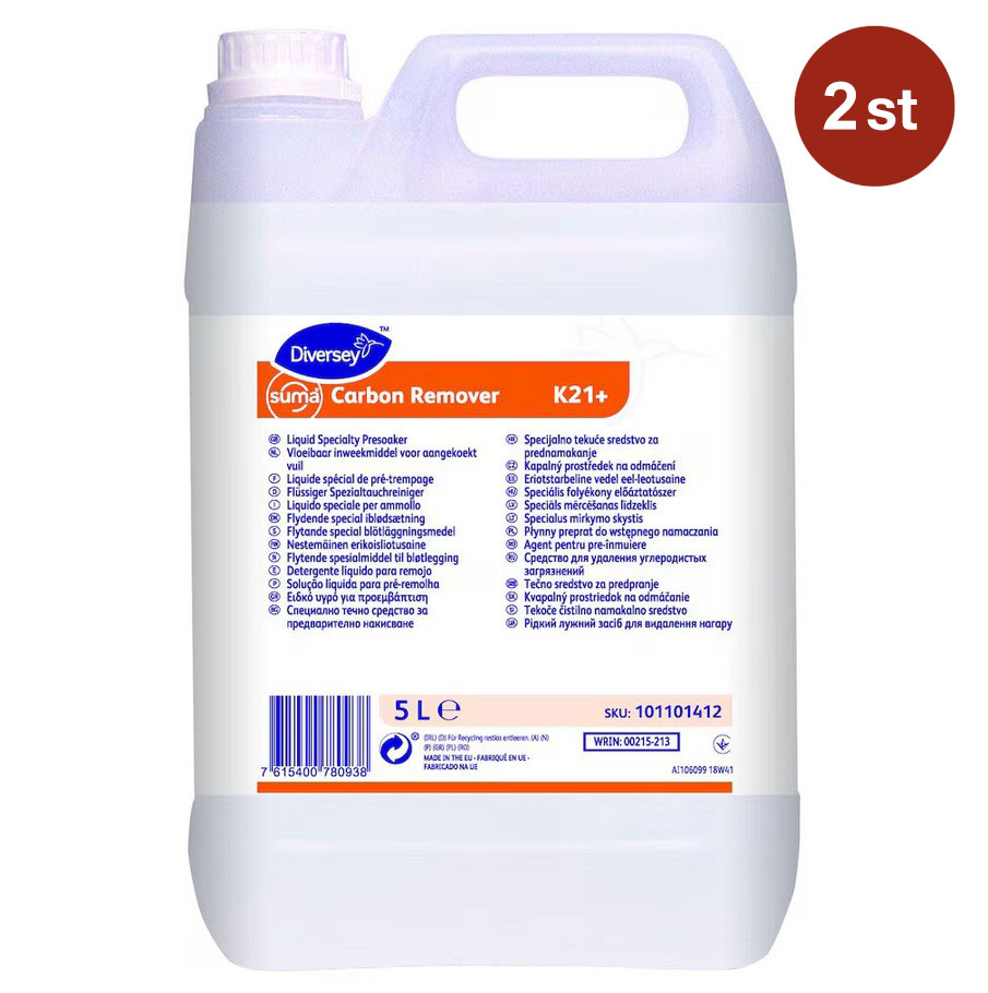 Suma Carbon Remover K21+ är en alkalisk vätska för blötläggning av kraftigt nedsmutsad köksutrustning och redskap. Den innehåller en optimerad mix av alkali och avhärdningsmedel för effektiv rengöring av fastbränt fett och inbrända matrester. Produkten rekommenderas att användas med avsedd blötläggningstank som en del av Diverseys DiveEasy blötläggningssystem. Den speciella formuleringen är säker att använda även på alla mjuka metaller, emaljerat gods, anodiserat aluminium eller teflonbelagda material.