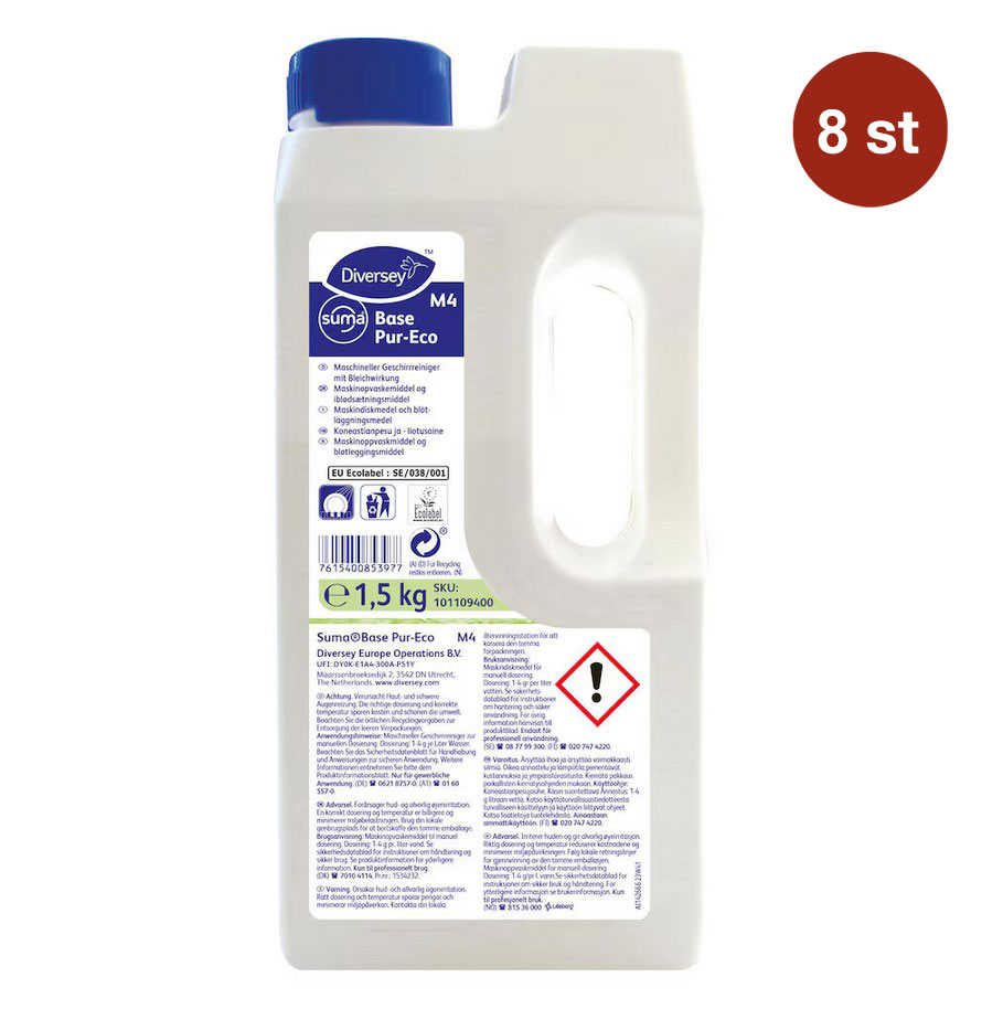 Suma Base Pur-Eco M4 är ett högeffektivt maskindiskmedel för mindre entanksmaskiner. Produkten är uppbyggd av en unik kombination av alkali och enzymer och löser effektivt fet och stärkelserik smuts. Produkten innehåller även komplexbildare för att effektivt förhindra kalkbildning i alla vattenhårdheter samt aktivt syre för effektiv borttagning av missfärgningar.