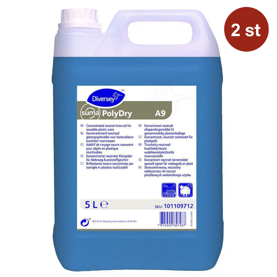 Suma PolyDry A9 är ett neutralt torkmedel framtaget speciellt för användning på olika typer av plastartiklar som Tritan och polypropylene i alla typer av diskmaskiner. Blandningen av noggrant utvalda tensider minskar ytspänningen i sköljvattnet. Detta gör att mindre droppar bildas på diskgodset och vattnet rinner av snabbare och minskar torktiden. Produkten ger även skumdämpning i diskmaskinen.