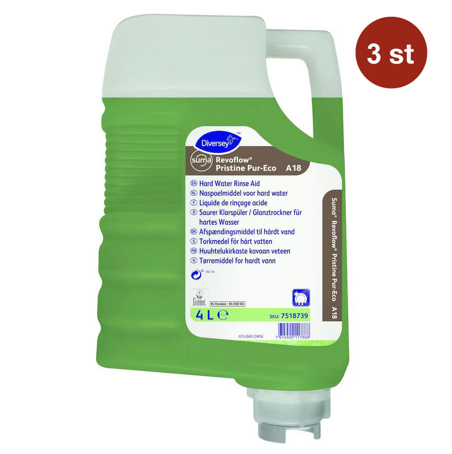 Suma Pristine Pur-Eco A18 är ett koncentrerat, surt torkmedel, speciellt framtaget för att passa i alla typer av diskmaskiner. Produkten är uppbyggd av en unik kombination lågskummande tensider som sänker vattnets ytspänning i slutspolningsvattnet. Detta förhindrar torkfläckar och ränder samt reducerar torktiden. Sammansättningen av tensider motverkar också kalkbildning i diskmaskinen. Produkten passar alla vattenhårdheter. Suma Revoflow Pristine Pur-Eco A18 doseras endast med Diverseys Revoflowsystem, vilket garanterar låg förbrukning, utmärkt torkresultat, säkerhet och enkelhet.