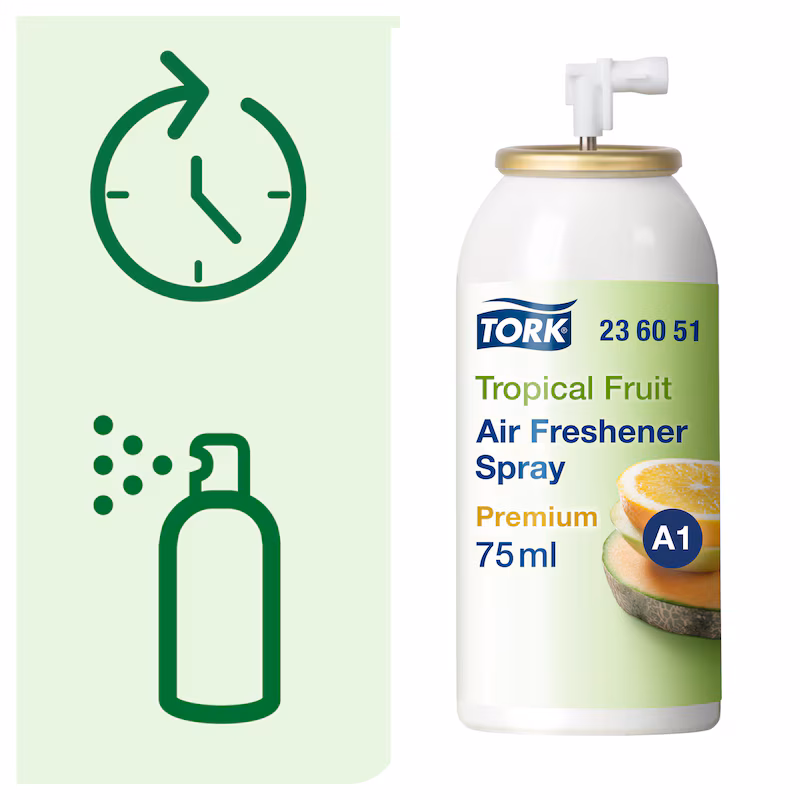 Tork Airfreshener Spray Frukt motverkar effektivt dålig lukt i toalettutrymmen. Varje spray innehåller koncentrerade doftoljor och luktneutraliserande ingredienser som eliminerar oönskade lukter och samtidigt sprider en varaktig och fräsch tropisk doft. Produkten är kompatibel med Tork Airfreshener-dispensrar och kan justeras för olika typer av utrymmen.