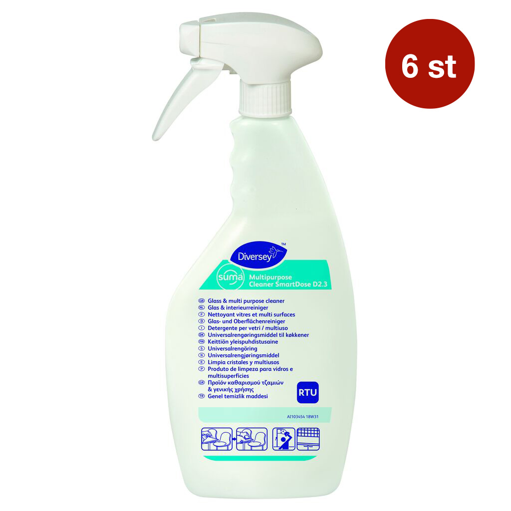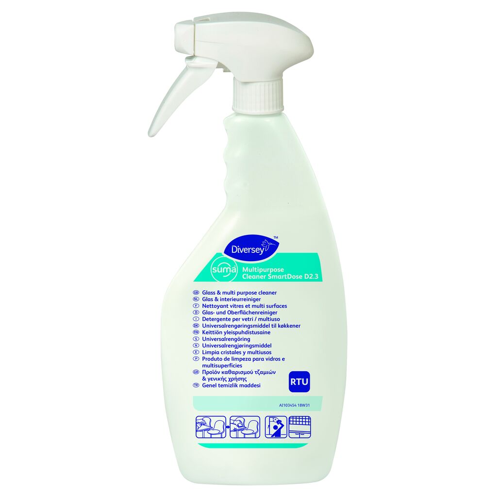 Allrent Diversey Suma Multipurpose Cleaner Smart Dose D2.3 är ett **multifunktionellt, högkoncentrerat rengöringsmedel** avsett för daglig rengöring av alla **vattentåliga hårda ytor i kök och livsmedelsmiljöer**. Det kan användas för att rengöra arbetsytor, golv, väggar, dörrar, tak, utrustning och även glasytor med ett skinande resultat utan ränder. Produkten är utformad för att vara **effektiv mot fett och fasttorkad mat**, samtidigt som den är ekonomisk i användning tack vare den höga koncentrationen och SmartDose-doseringstekniken.