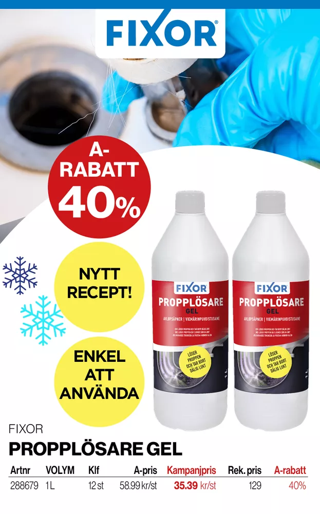 Varumärke Fixor by Nitor EAN 7319482886792 Typ Avloppsrengöring Kategori Rengöringsmedel Volym 1 L Innehåll Fosfonater -