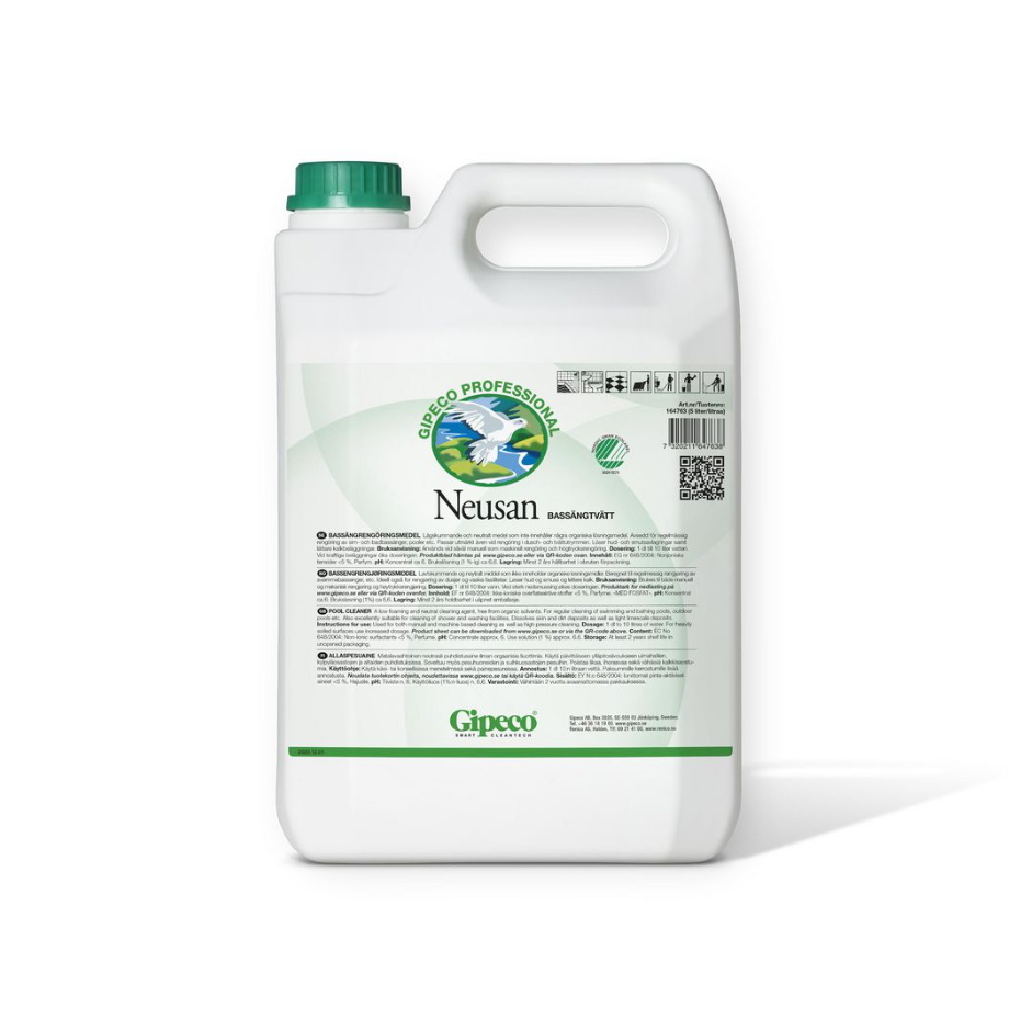 Gipeco Neusan är ett lågskummande och neutralt rengöringsmedel för sim- och badbassänger samt poolmiljöer. Produkten innehåller inga organiska lösningsmedel och löser effektivt hud- och smutsavlagringar samt lättare kalkbeläggningar i ett och samma arbetsmoment.
